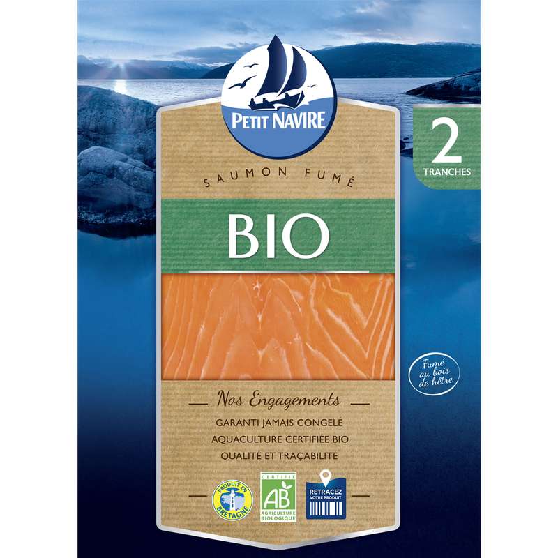 Saumon fumé. Ingrédients : Saumon Atlantique (Salmo salar) issu de l'agriculture biologique 97,2%, sel 2,8% Quantité : 60 g Marque : Petit Navire