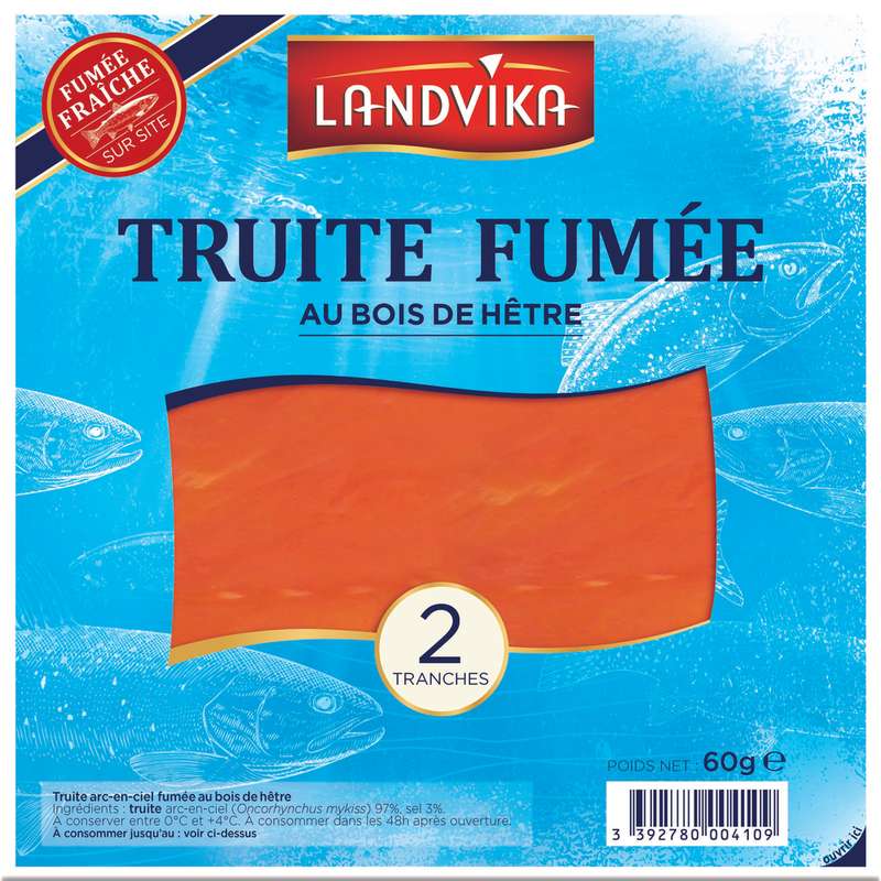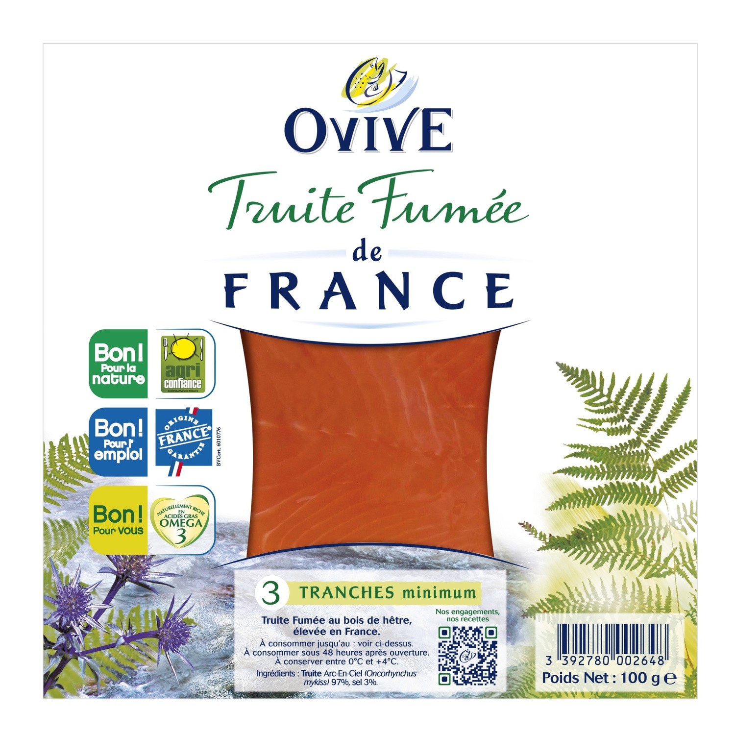 Truite fumée au bois de hêtre. Ingrédients : Truite Arc-En-Ciel (Oncorhynchus mykiss) 97%, sel 3%. Quantité : 3 Marque : Olive Origine : France