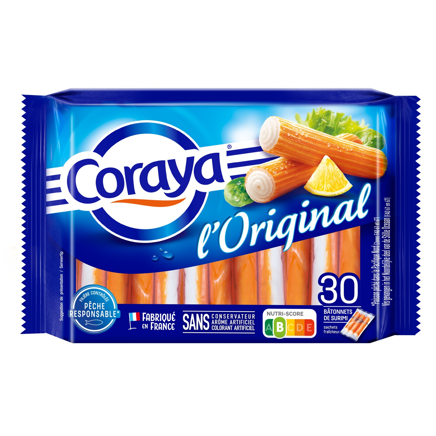 bâtonnets de surimi. Ingrédients : chair de poisson (38%), eau Quantité : 45 g Marque : coraya l'original Origine : mer. francaise