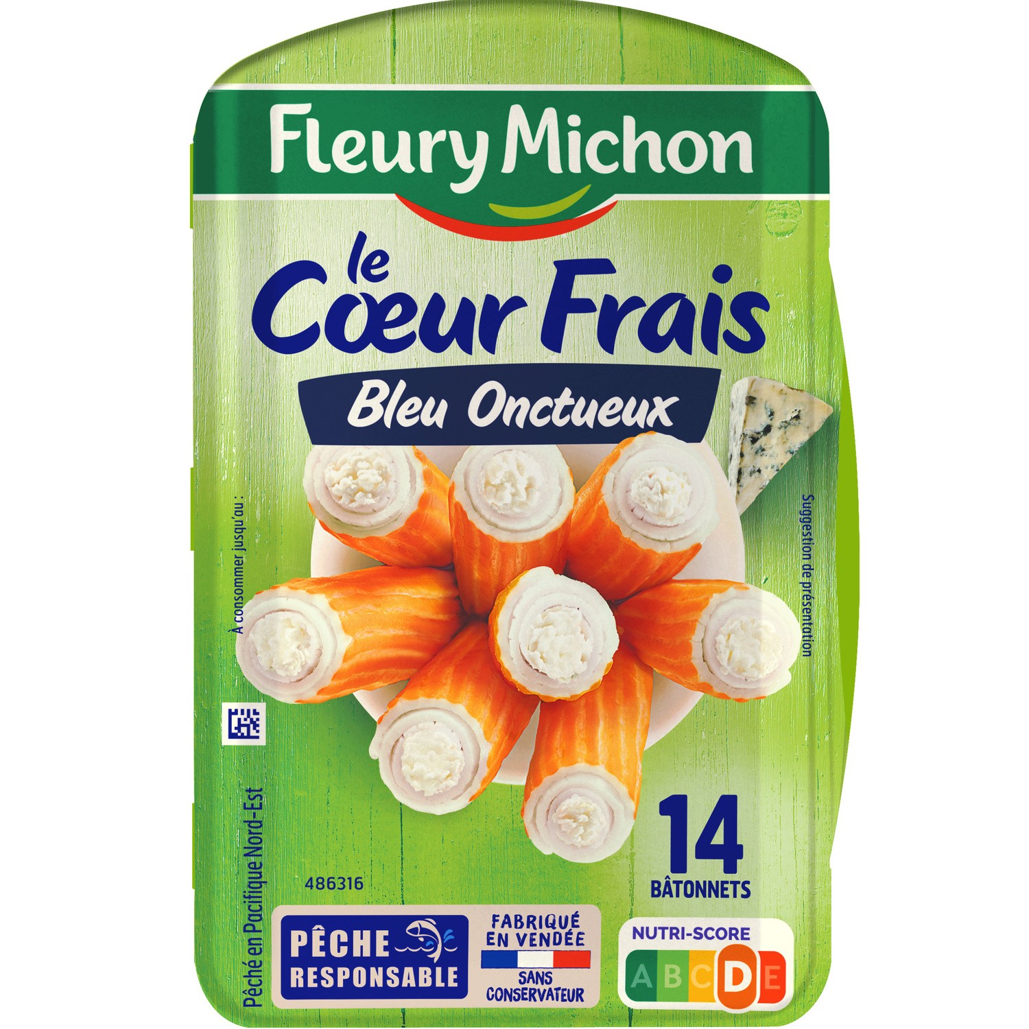 Le Coeur Frais Bleu onctueux - 14 bâtonnets. Ingrédients : Eau, chair de _poisson_* 29%, _fromage_ 13% (_fromage_, sel), amidons (dont _blé_), huile de colza,...