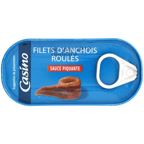 Filets d'anchois sans peau roulés à la sauce piquante (36%). Ingrédients : Filets d'_anchois_ salés sans peau 64% [_anchois_ (engraulis encrasicolus) - sel] - huile...