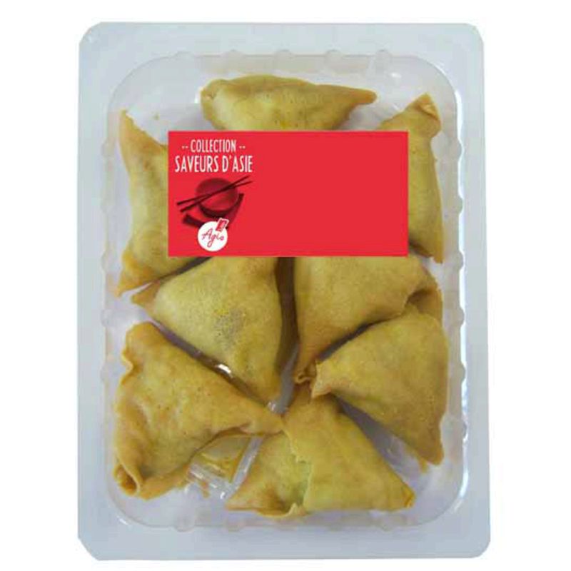 8 Galettes de blé garnies à base de viande de boeuf et curry 25g + 1 sauce aigre douce 20g.. Ingrédients : Samossas boeuf curry...
