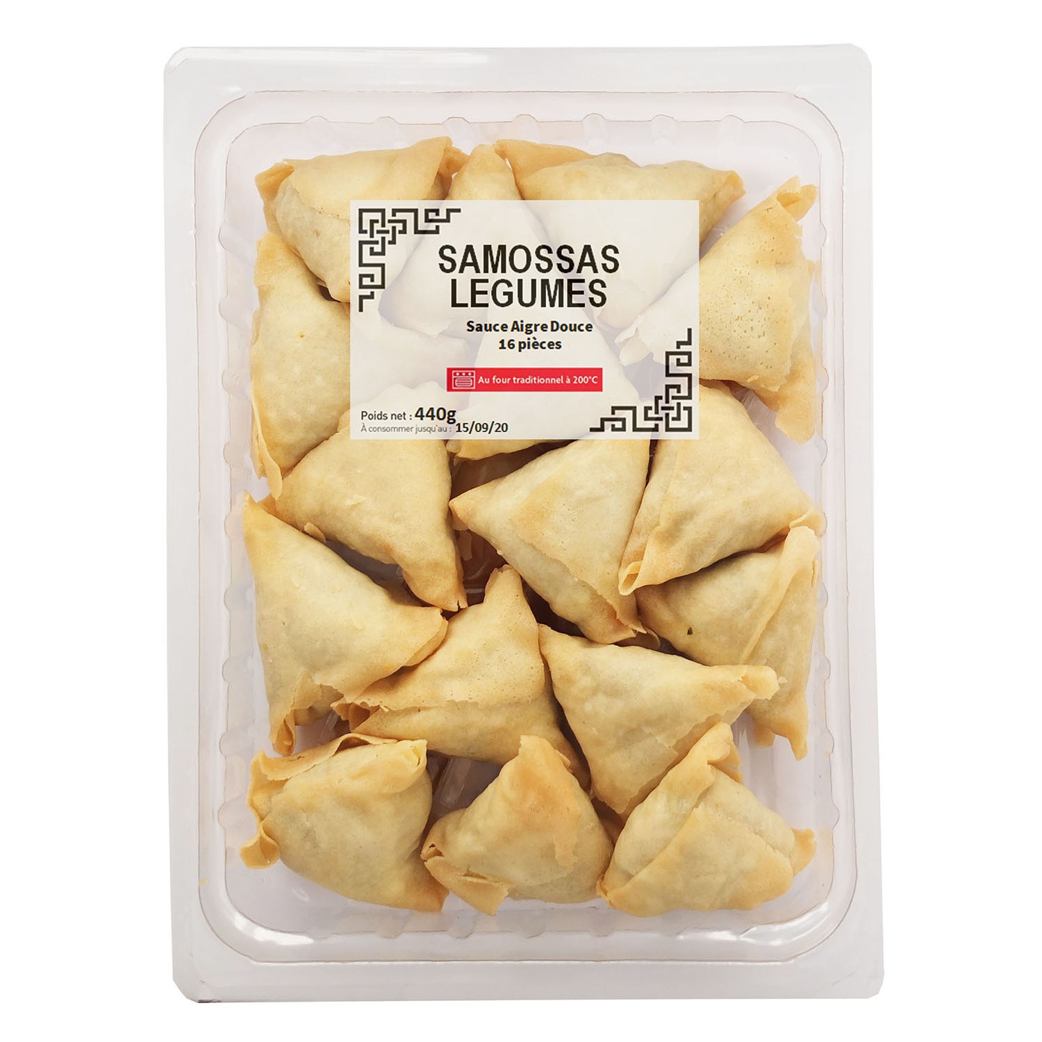 Samosas aux legumes.IngrédientsGalette de BLÉ 40.4% (eau, farine de BLE, huile de tournesol, blanc d'OEUF en poudre, sel, émulsifiant : lécithine de colza), carotte 10.1%,...