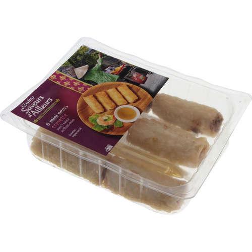 6 galettes de riz (40%) frites garnies d'une farce aux légumes, à la crevette et au cabillaud avec sauce nuoc-mâm. Ingrédients : Nems aux _crevettes_...