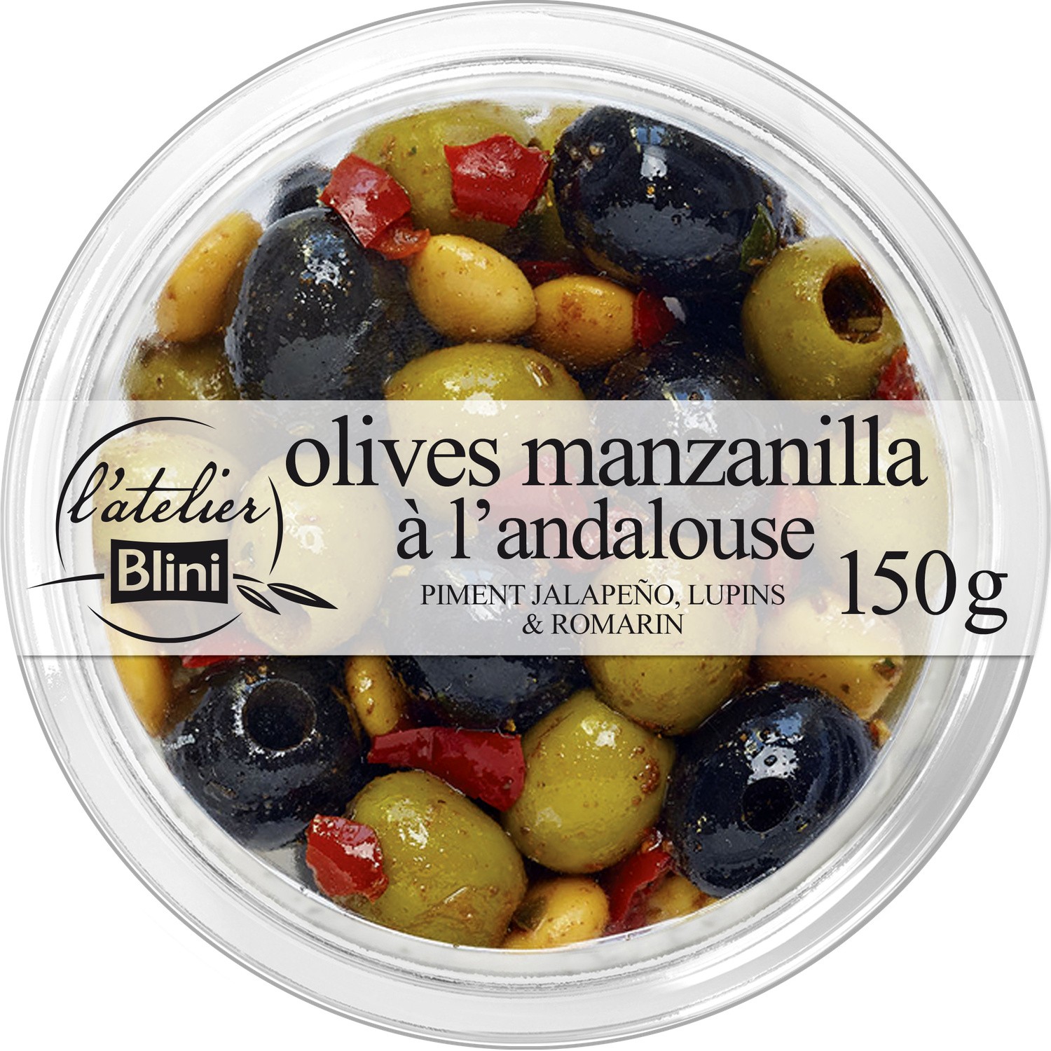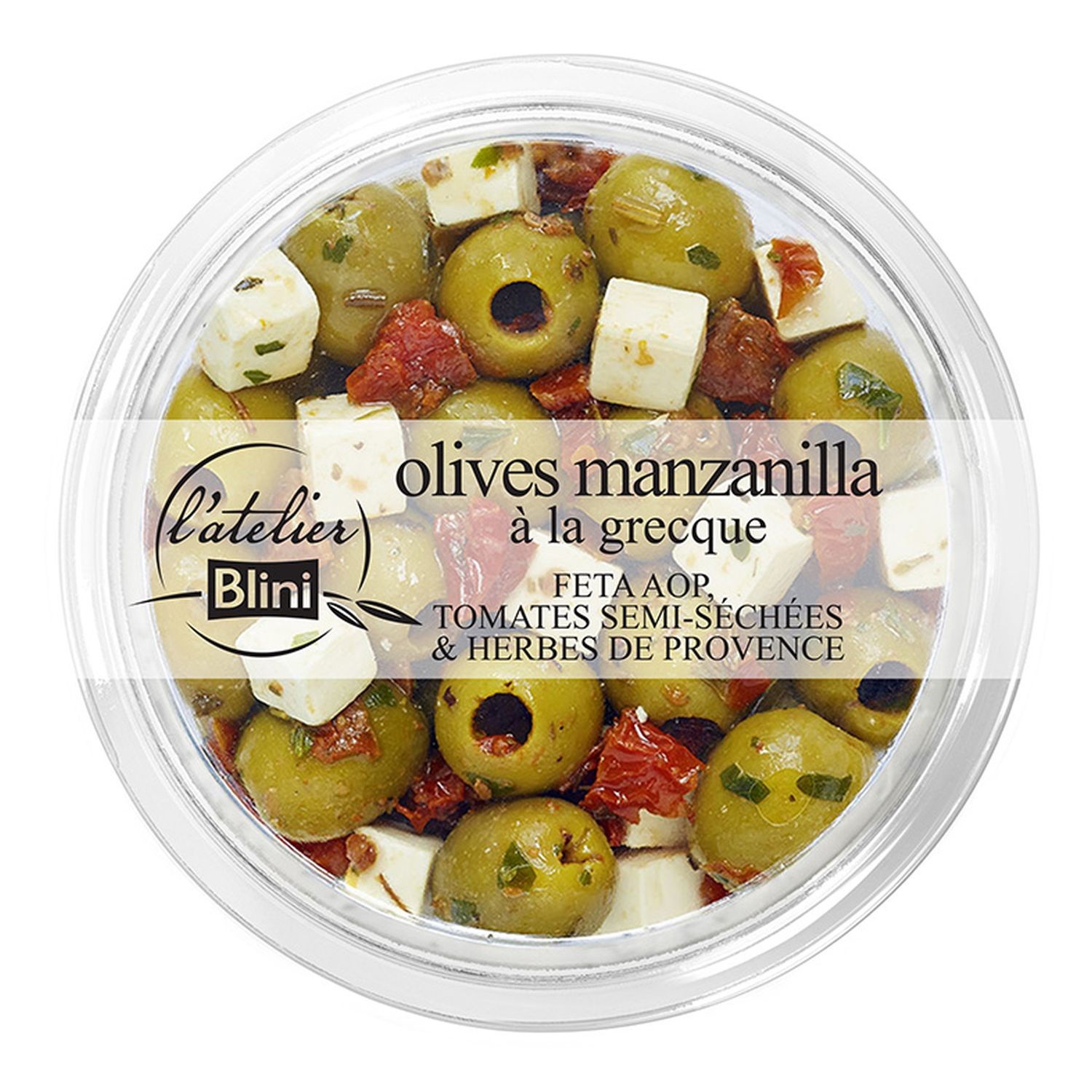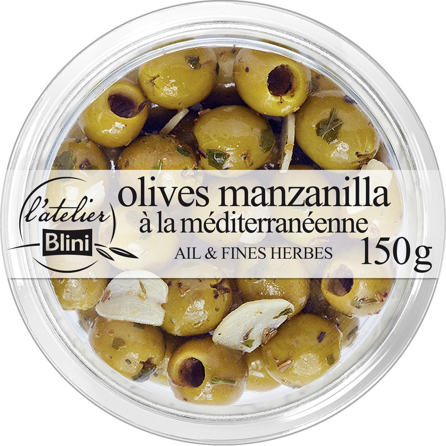 Mélange d'olives préparées. Ingrédients : Olives vertes 85,6 %, huile de colza, sel, ail 1,1 %, herbes de Provence 0,5 %, persil, vinaigre d'alcool, conservateur...