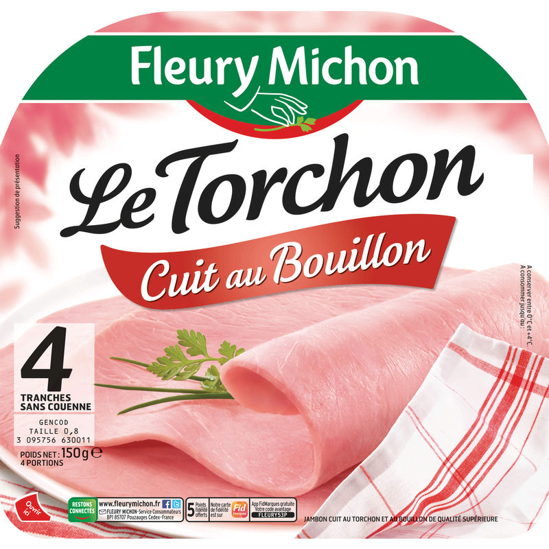 Jambon blanc Le Torchon Cuit au Bouillon. Ingrédients : jambon de porc, fond de porc (eau, os de porc, viande de porc, échalote, ail, épices,...