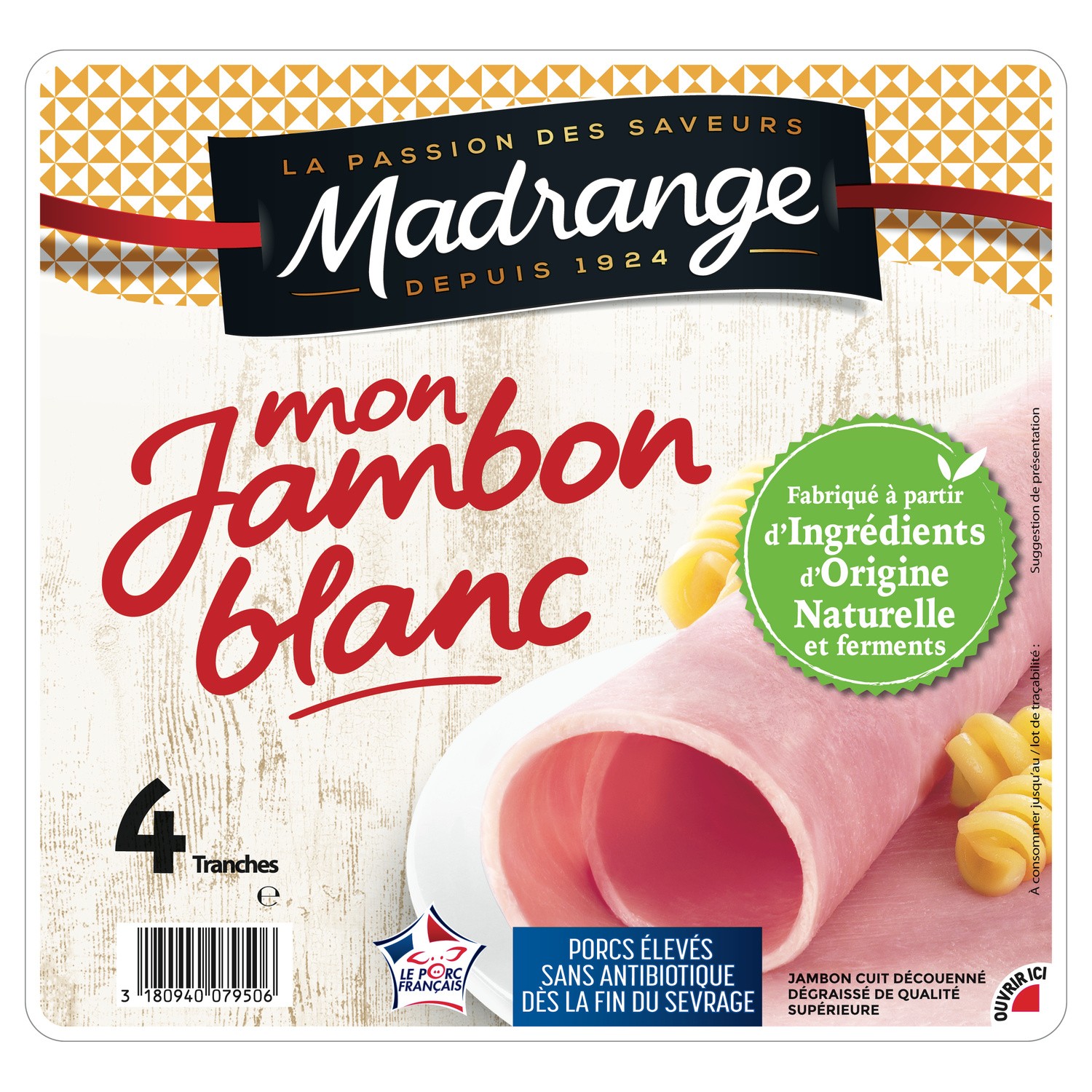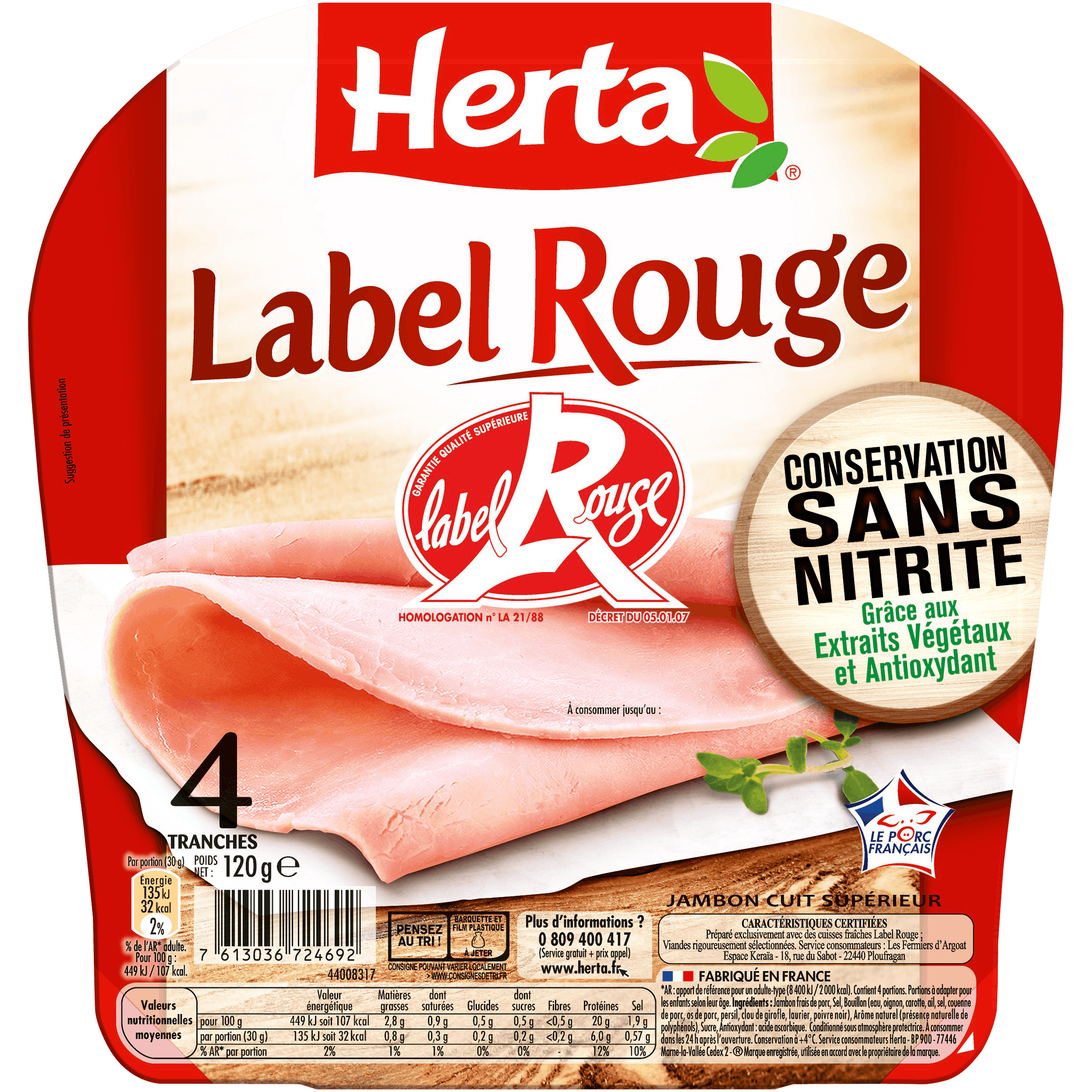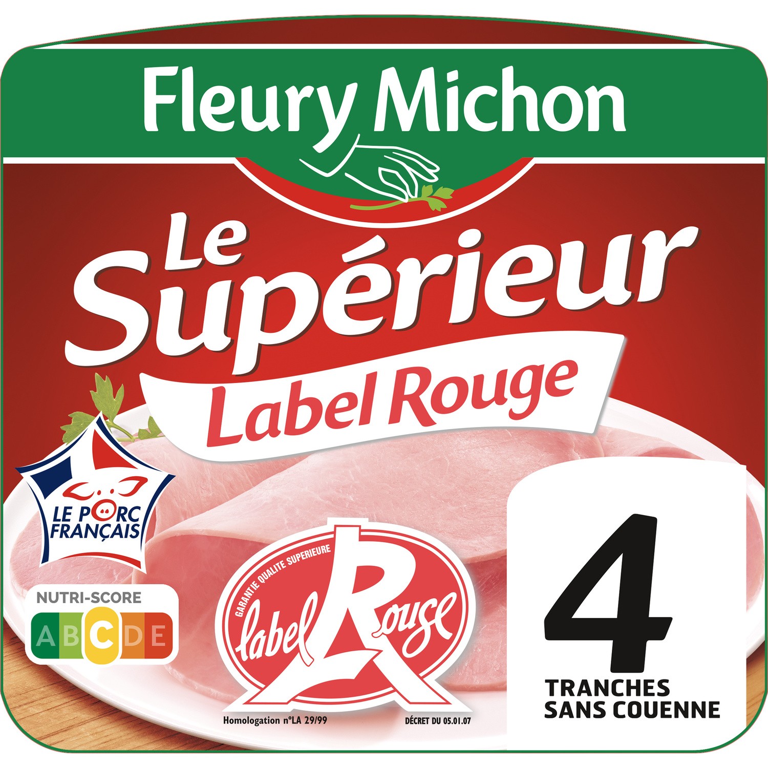 Le supérieur Label Rouge - 4 tranches sans couenne. Ingrédients : Jambon frais de porc Label Rouge, sel, bouillon de légumes 1% (eau, _céleri_, carotte, jus...