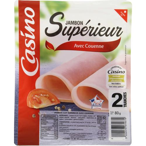 Jambon cuit supérieur avec couenne. Ingrédients : Jambon de porc frais (origine : France) - sel - arômes naturels - dextrose - antioxydant : érythorbate...