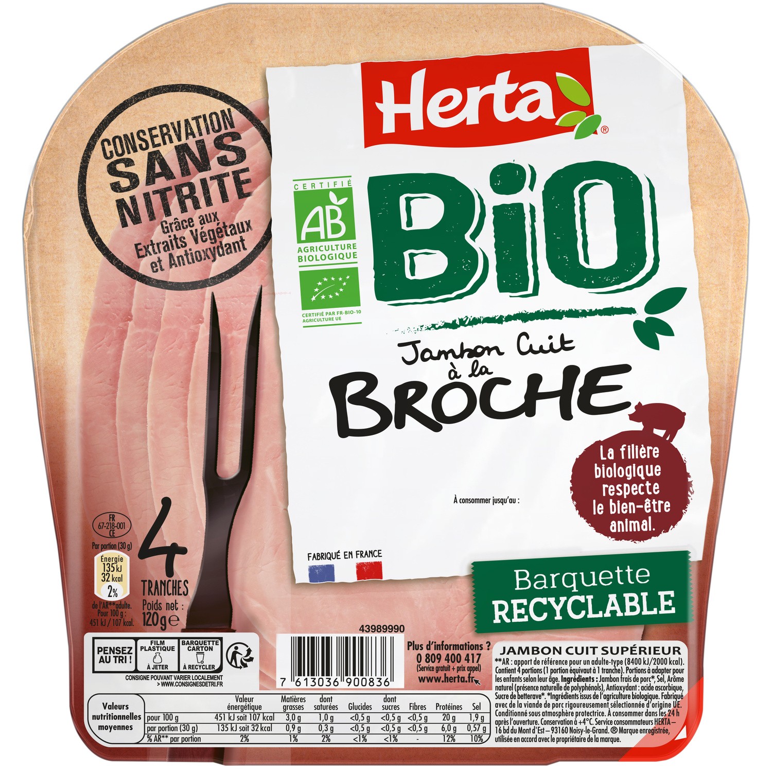 Jambon cuit à la broche. Ingrédients : Jambon frais de porc*, Sel, Arôme naturel, antioxydant: acide ascorbique Sucre de betterave*. *Ingrédients issus de l'agriculture biologique....
