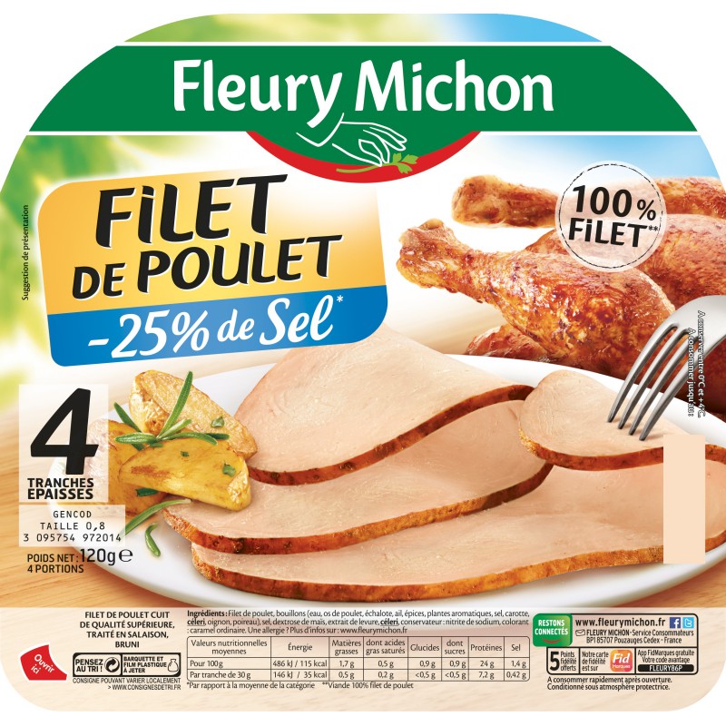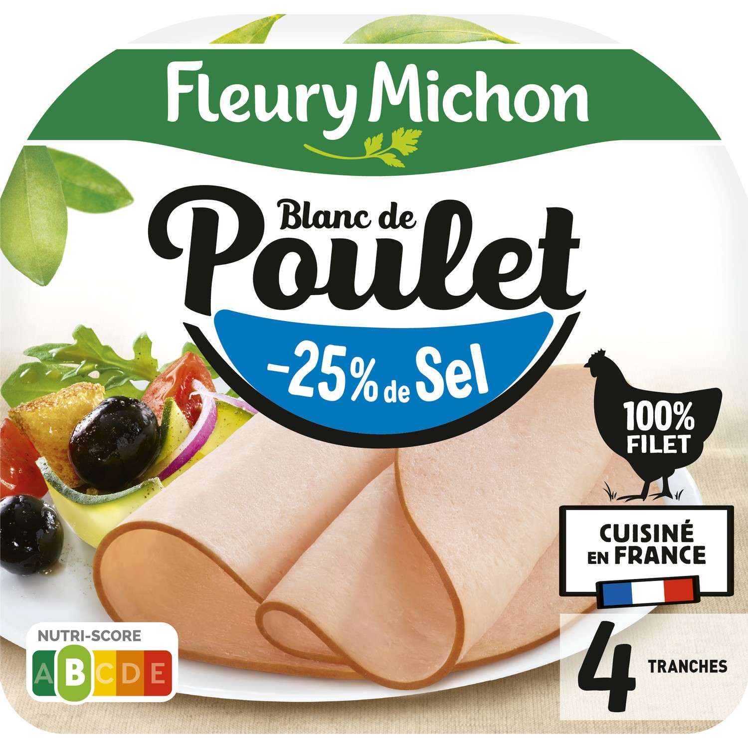Blanc de poulet - 25% de sel* - 100% filet** - 6 tranches fines. Ingrédients : Filet de poulet 94%, bouillons (eau, _céleri_, plantes aromatiques,...