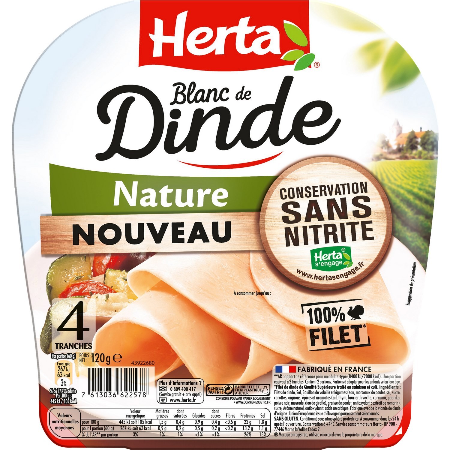 Blanc de dinde nature. Ingrédients : Filets de dinde, Sel, Bouillon de volaille et légumes (eau, morceaux de poulet, sel, sucre, carottes, oignons, épices et...