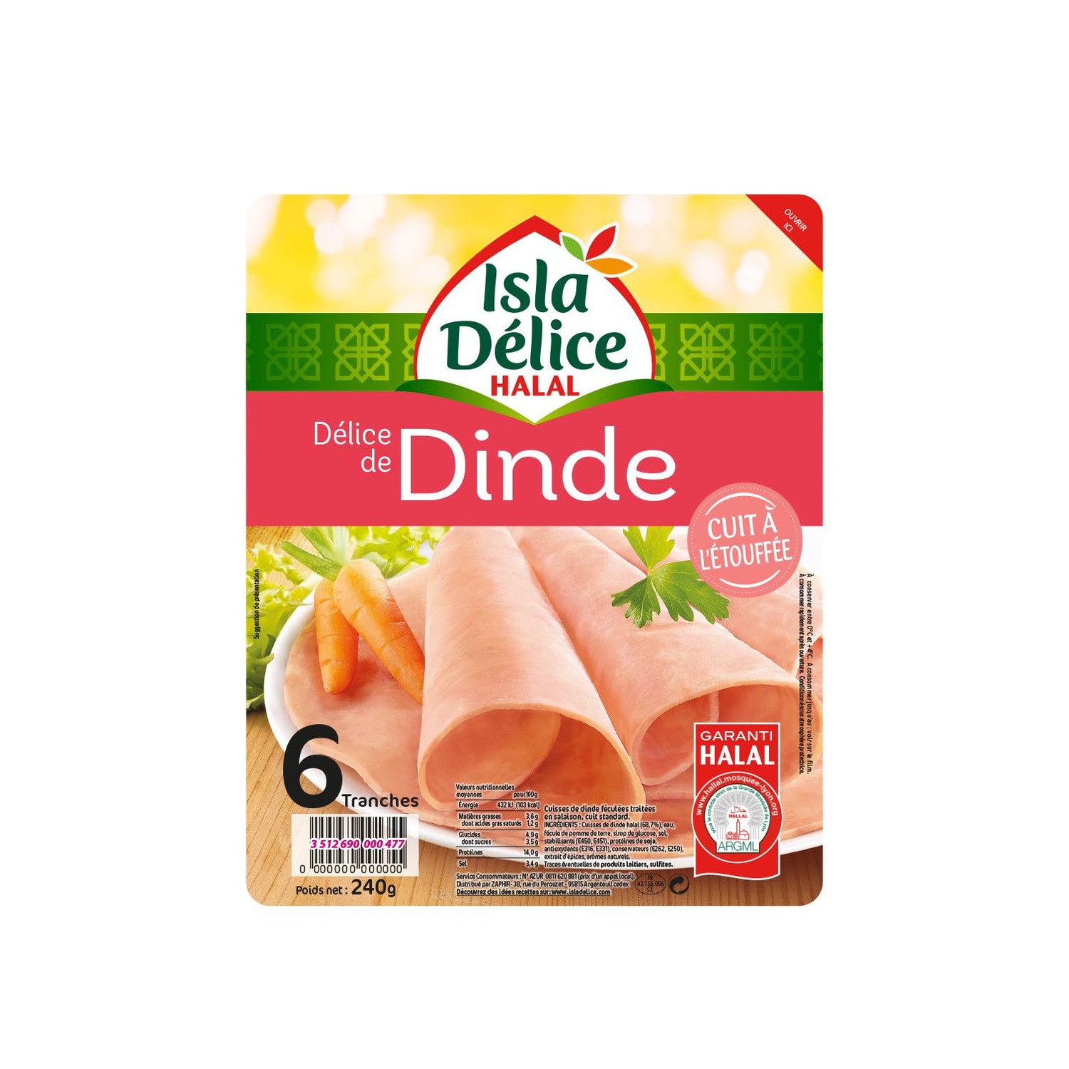 Cuisses de dinde féculées traitées en salaison, cuit standard. Ingrédients : Cuisses de dinde halal (68,7%), eau, fécule de pomme de terre, sirop de glucose,...
