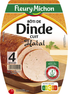 Rôti de Dinde cuit - Halal. Ingrédients : Filet de dinde 89%, eau, sel, plantes aromatiques 0.3%, concentrés de betterave et _céleri_, dextrose de maïs,...