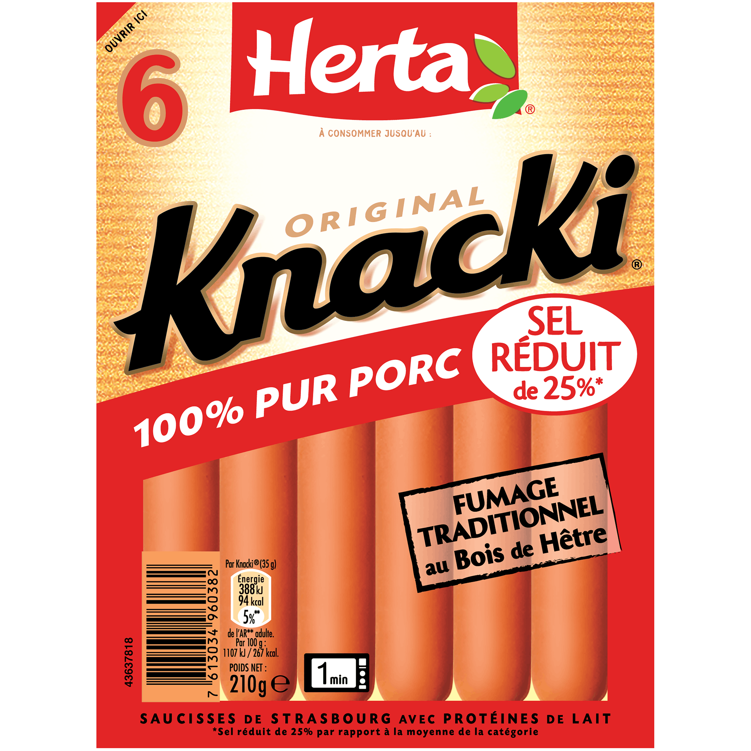 Saucisse de Strasbourg avec protéines de lait à teneur en sel réduite de 25 %. Quantité : 210 g Marque : Herta
