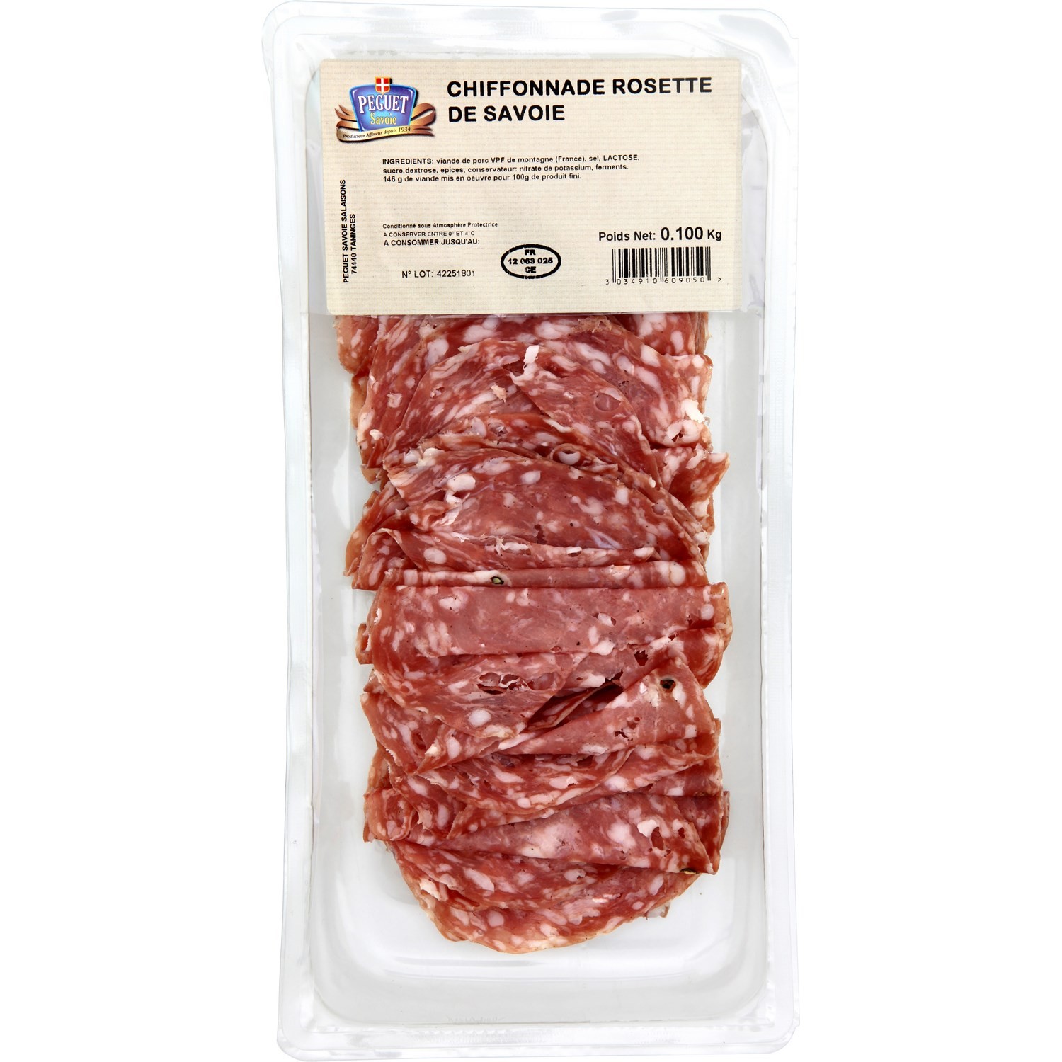Chiffonnade rosette de Savoie. Ingrédients : viande de porc VPFY sel/ LACTOSE epices, sucref dextrose, conservateur nitrate de potassiumE de viande mise en oeuvre pout100g...