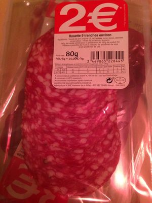Rosette. Ingrédients : Viande de porc origine UE, sel, lactose, sucret épices conservateur : nitrate de potassium, ferments 140g de viande utilisés pour la préparation...