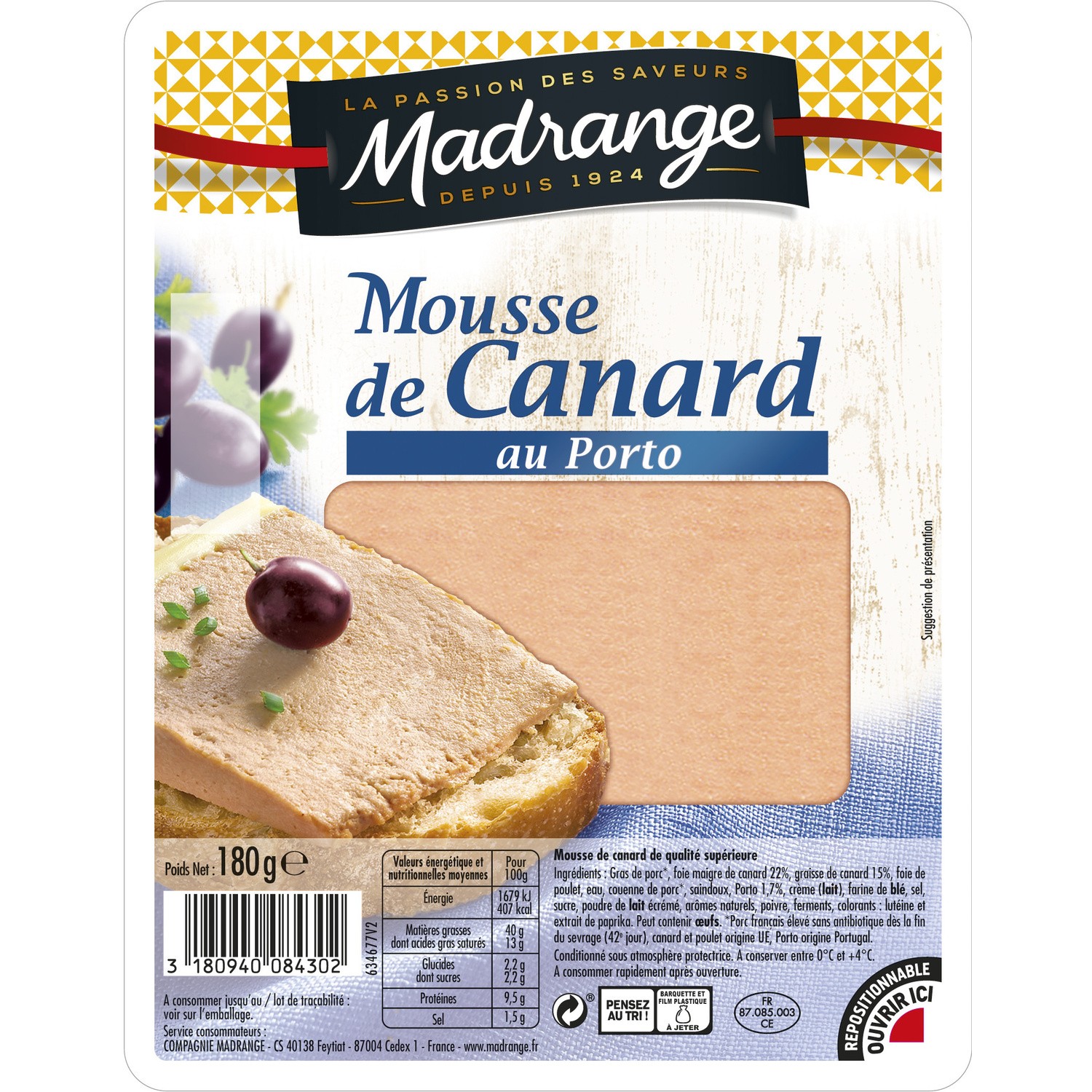 Mousse de canard de qualité supérieure. Ingrédients : Gras de porc*, foie maigre de canard 22%, graisse de canard 15%, foie de poulet, eau, couenne...