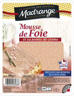 Mousse de foie de qualité supérieure. Ingrédients : Gras de porc*, foie de porc* 25%, eau, LAIT écrémé, couenne de porc*, farine de BLÉ, sel,...