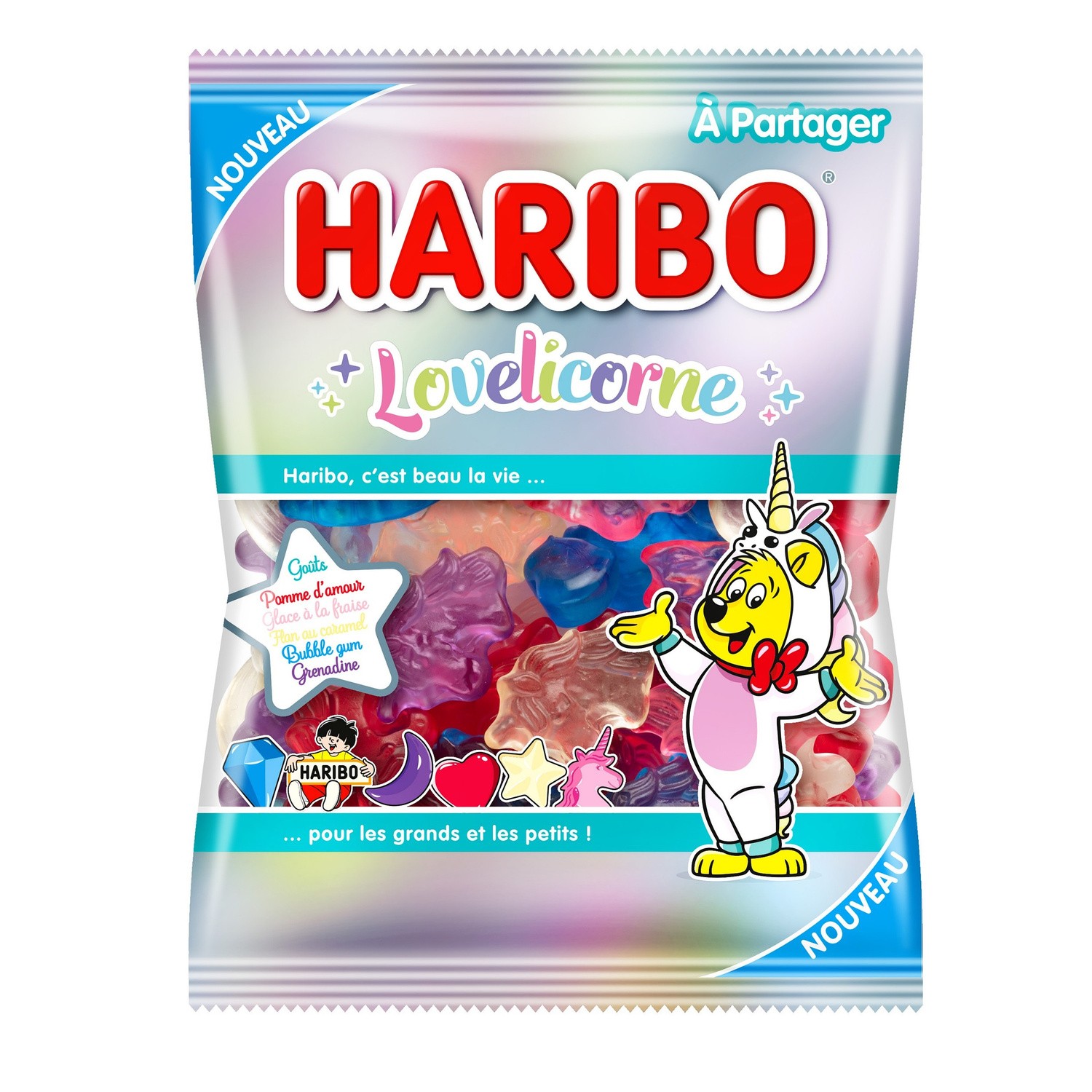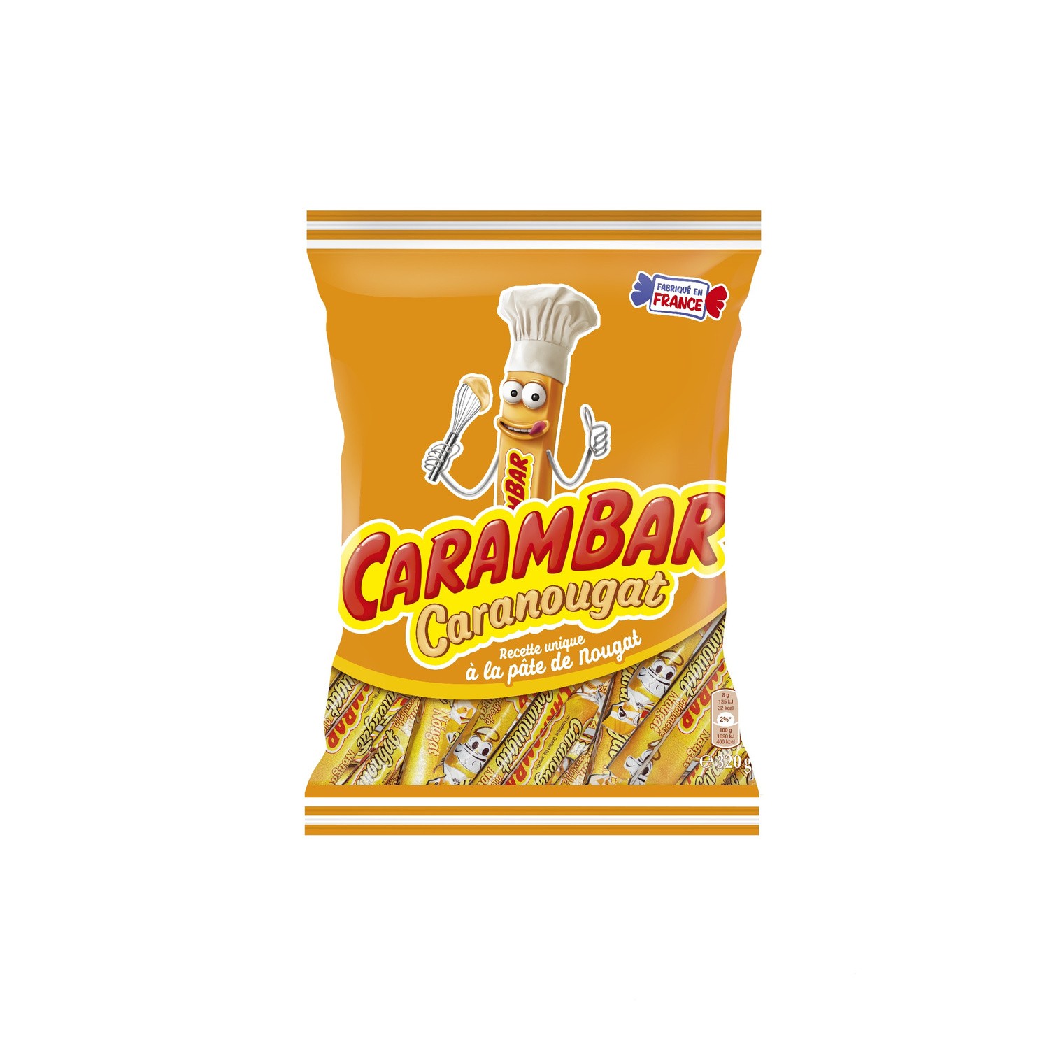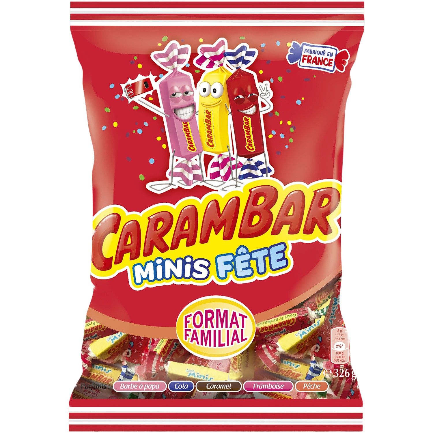 Carambar minis fête. Ingrédients : Sirop de glucose, sucre, lait écrémé.concentré sucré, huile de palme, acidifiant (acide maigre en poudre, gélatine, colorants (E150d, E163, E160c;...