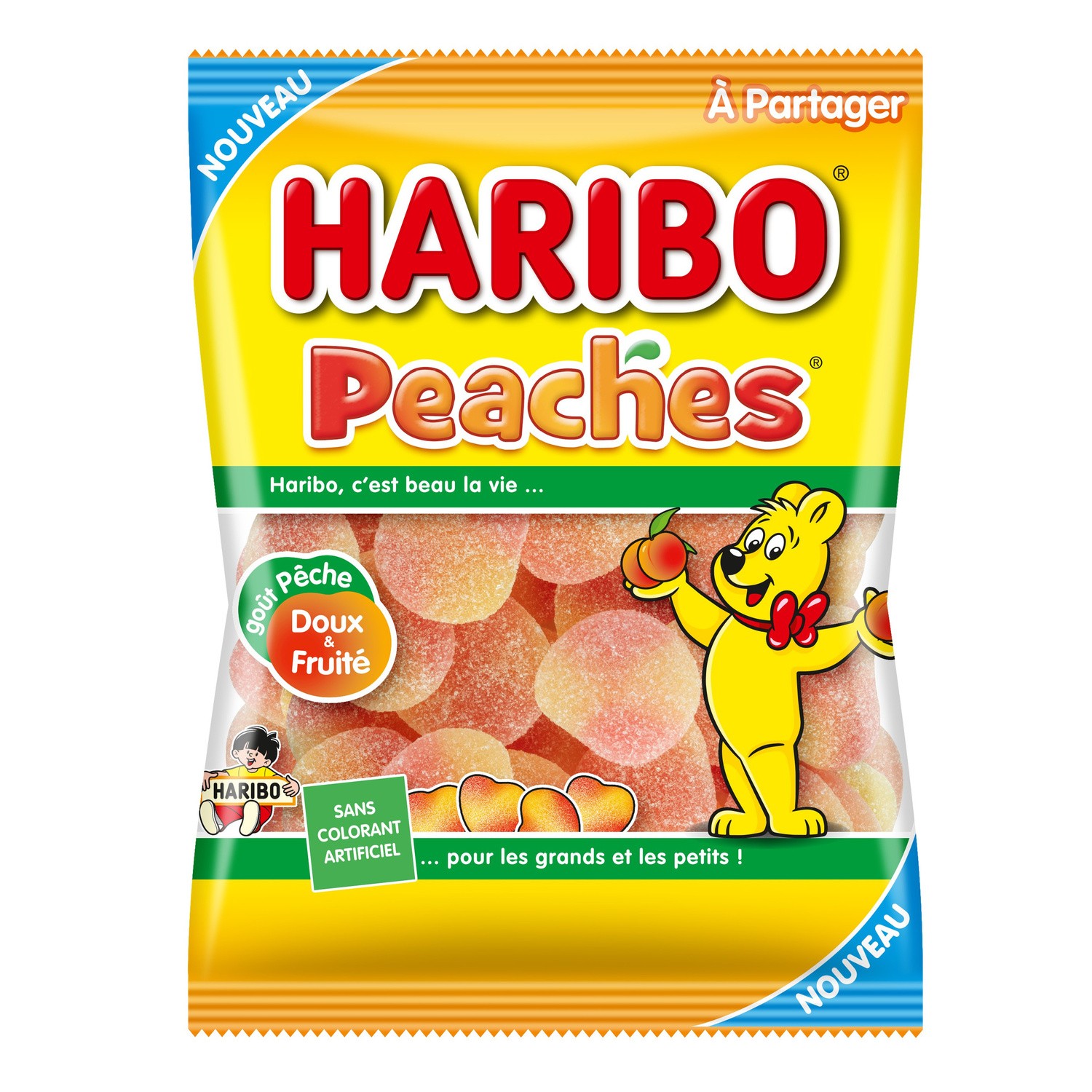Haribo Peaches. Ingrédients : sucre; sirop de glucose; gélatine; acidifiant: acide citrique; arôme; concentré de fruits et de plantes: citron, carthame, pomme, cassis, baie de...