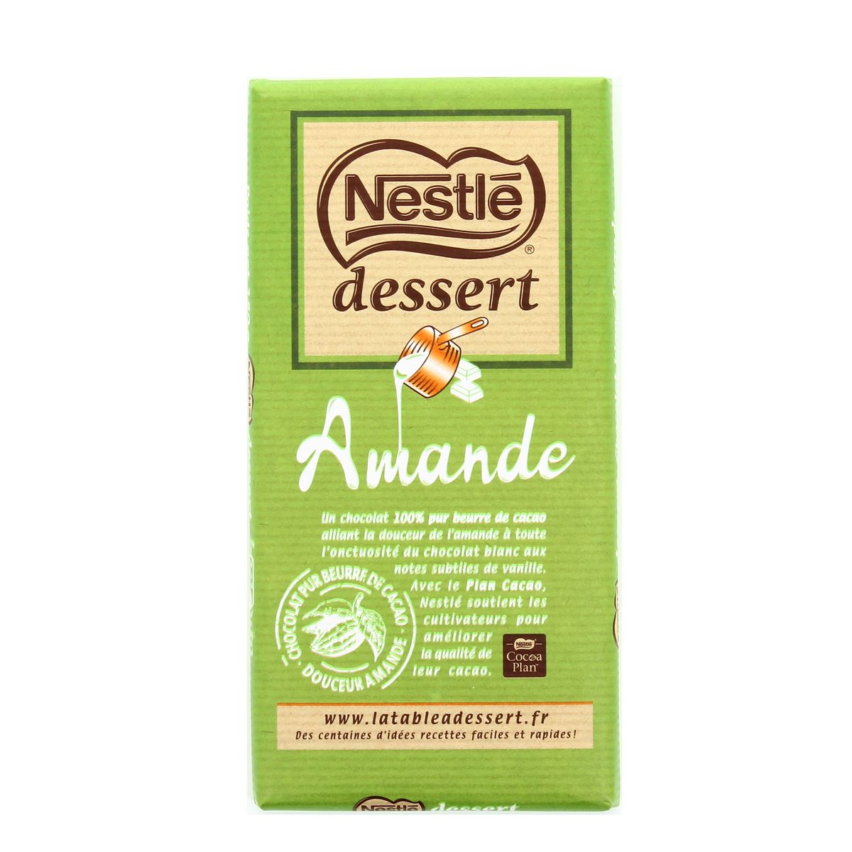 Chocolat blanc à la saveur amande. Ingrédients : Sucre, LAIT entier en poudre, beurre de cacao, AMANDES en poudre 0,5%, émulsifiant (lécithines), arôme naturel, arôme...