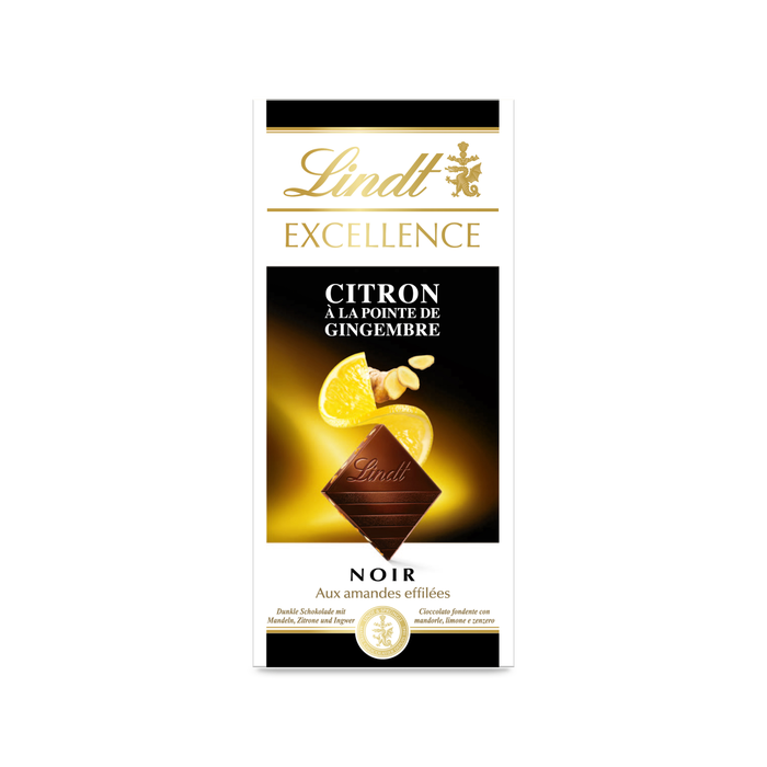 Excellence citron pointe de gingembre. Ingrédients : Sucre, pâte de cacao, amandes 7%, beurre de cacao, beurre laitier concentré, citron 1,6%, pomme, ananas, émulsifiant (lécithine...