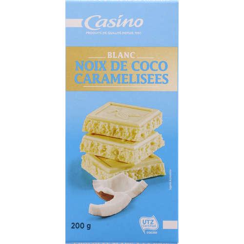 Chocolat blanc à la noix de coco râpée caramélisée. Ingrédients : Sucre - beurre de cacao - noix de coco râpée caramélisée 20% (noix de...