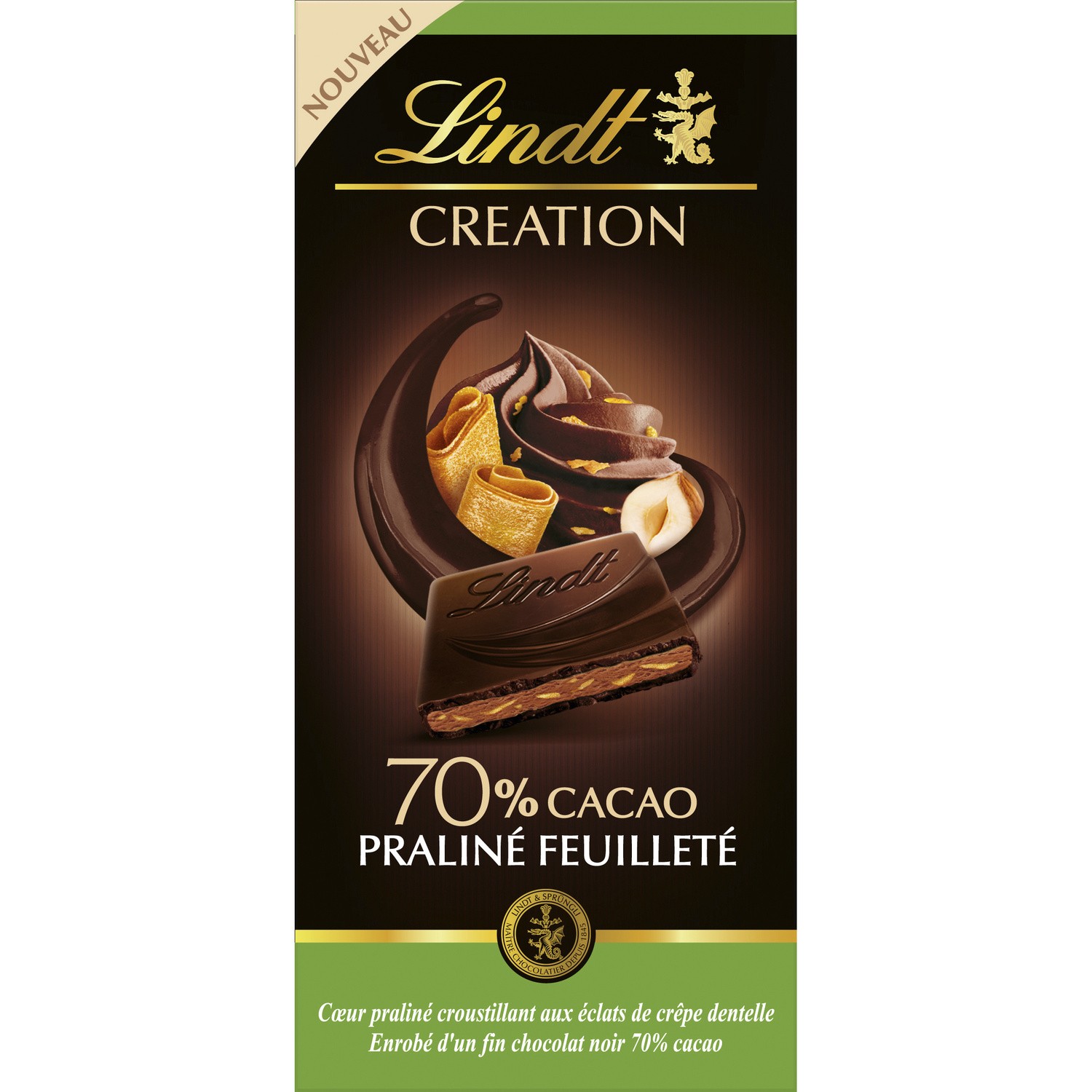 Création praliné feuilleté. Ingrédients : Pâte de cacao, sucre, praliné aux amandes et aux noisettes (sucre, amandes, noisettes) 12%, beurre de cacao, cacao maigre, matière...