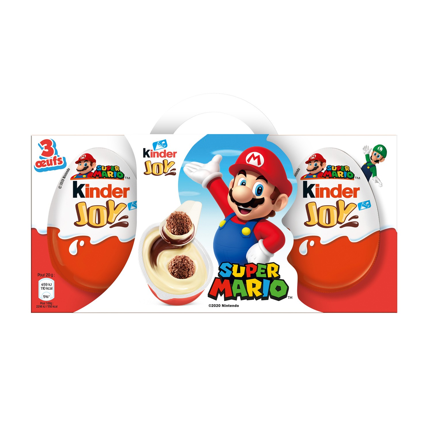 KINDER JOY : Crème-dessert au lait et cacao maigre, avec fines gaufrettes enrobées de cacao, accompagnée d'une surprise. Ingrédients : Sucre, graisses végétales (palme, karité),...