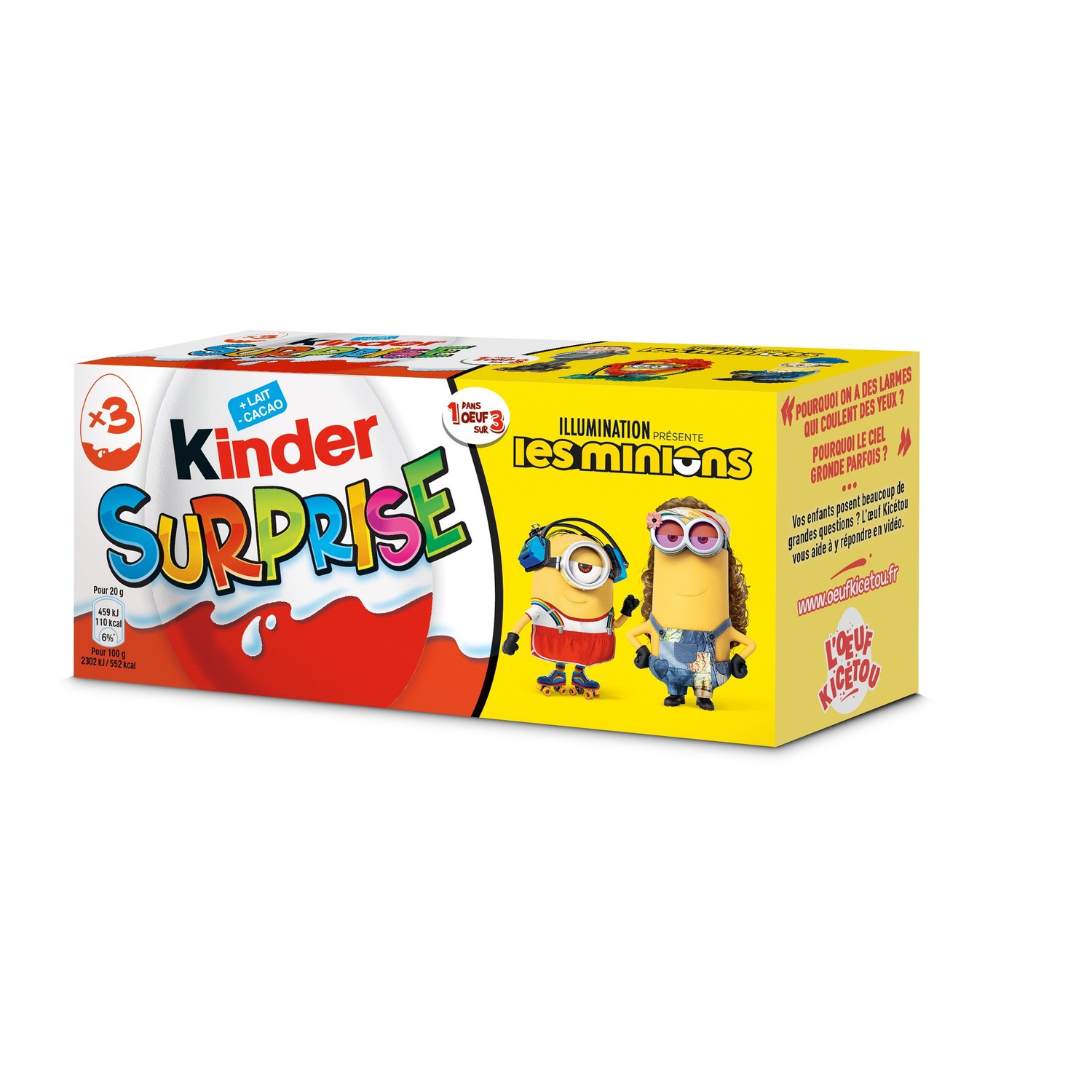 KINDER SURPRISE : Confiserie recouverte de chocolat supérieur au lait contenant une surprise dans une capsule plastique. Ingrédients : Chocolat supérieur au LAIT 47% (sucre,...