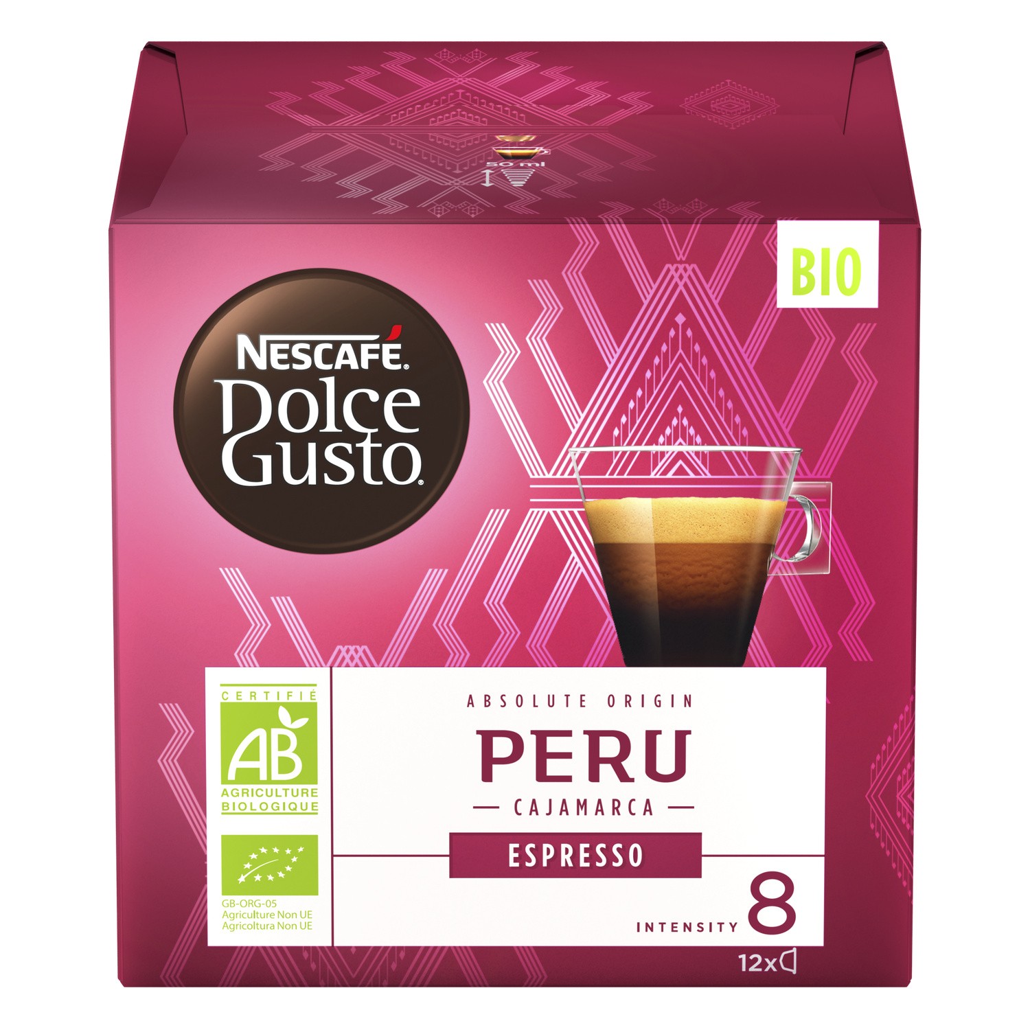 Absolute origin PERU cafe. Ingrédients : Café torréfié moulu biologique. Quantité : 12 Marque : Nescafé, Dolce Gusto Origine : Amérique du Sud
