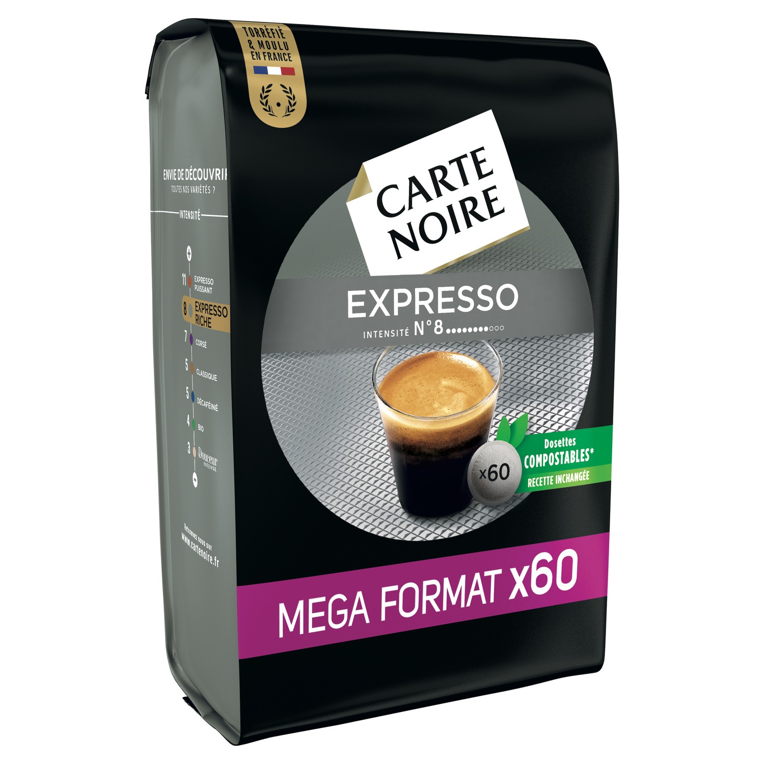 Café dosettes Espresso n°8 Carte Noire. Ingrédients : 100% café moulu, grains d'origine Amérique du Sud et Centrale et Asie du Sud-Est Quantité : 420g...