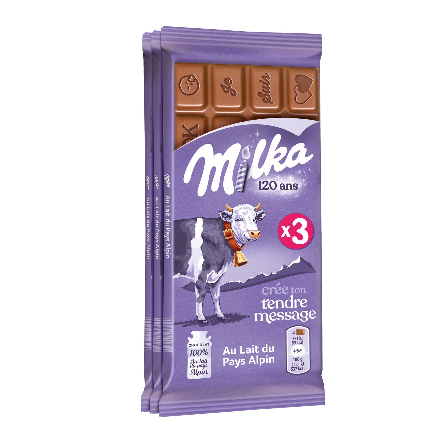 Chocolat au Lait du Pays Alpin. Ingrédients : Sucre, beurre de cacao, poudre de _lait_ écrémé, pâte de cacao, _lactosérum_ en poudre (de _lait_), _beurre_...