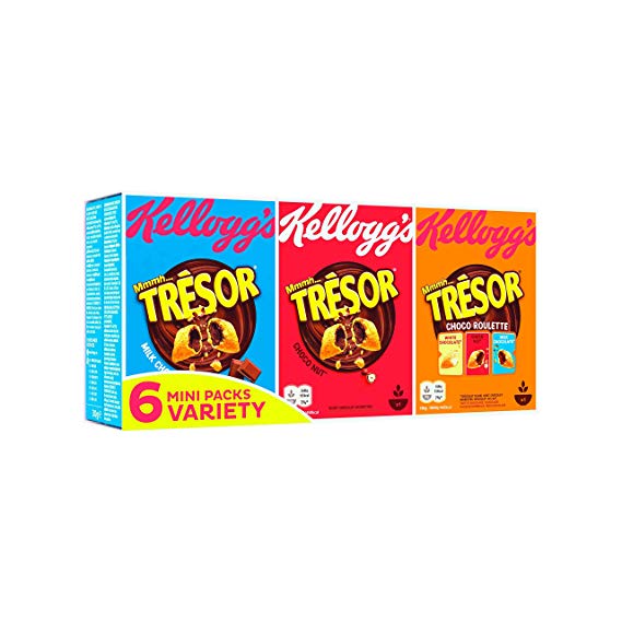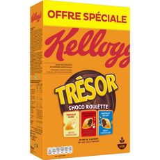 Trésor Kellogg's Choco Roulette offre spécual. Ingrédients : Farines de céréales(blé{25%}, avoine complète(16%)}, riz{11%}), sucre, huiles végétales(palme, tournesol, colza) en proportions variables, chocolat au lait(4.5%)(sucre,...