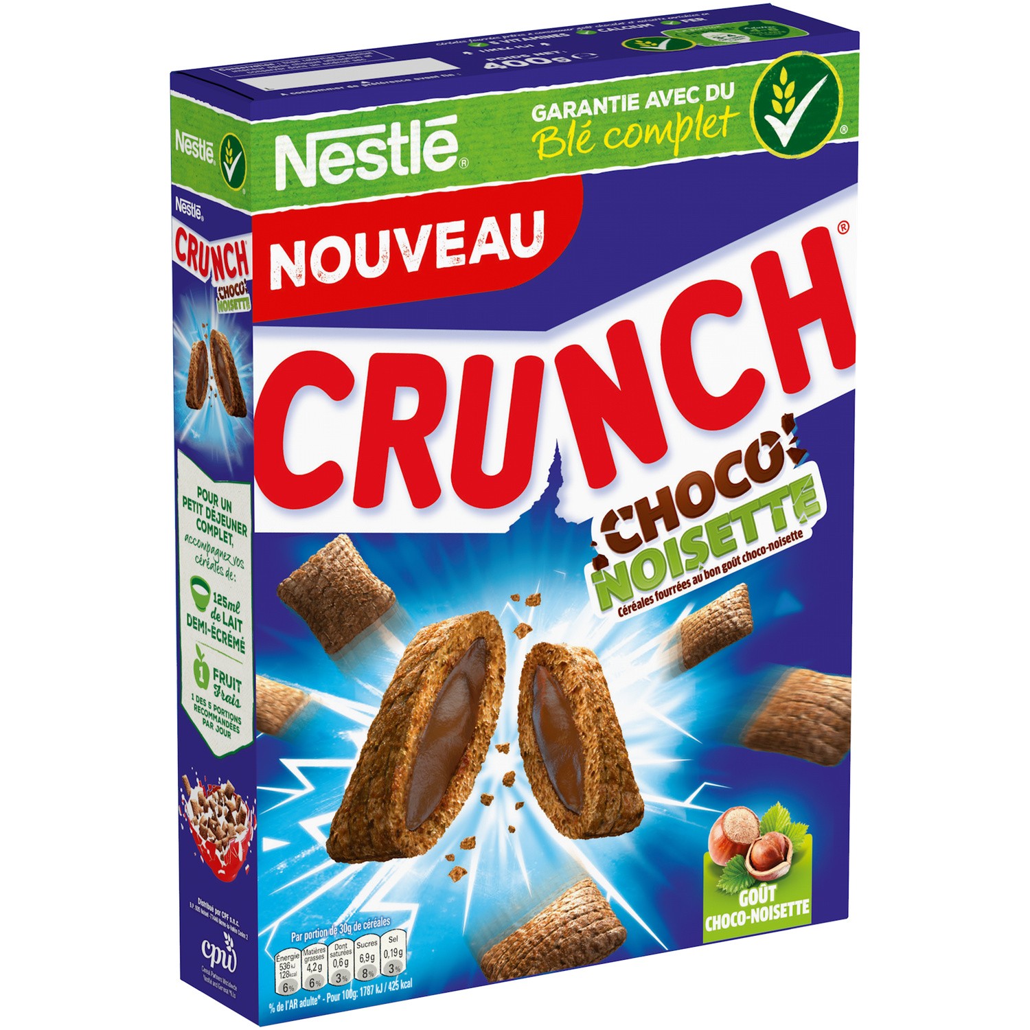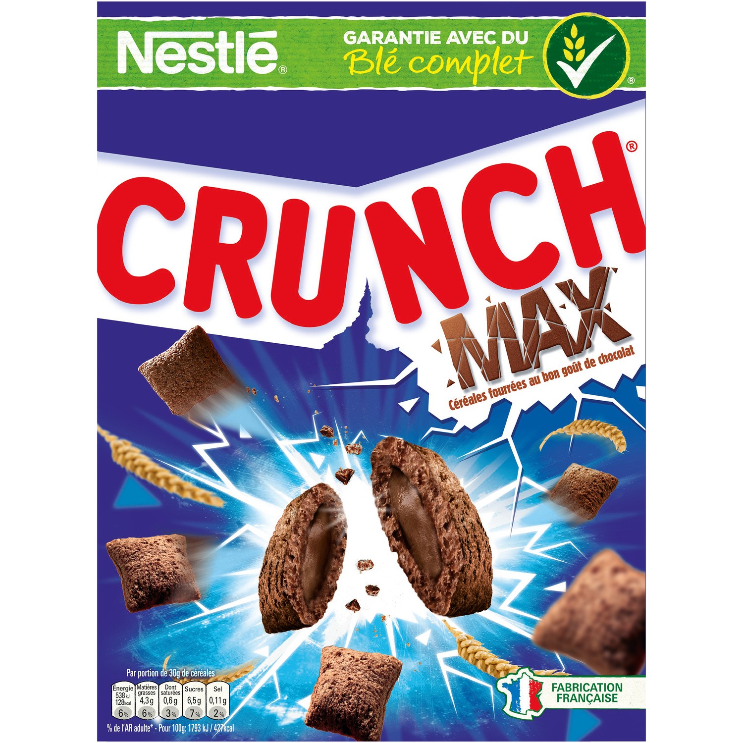 Crunch Max. Ingrédients : Céréales 51,4% (_blé_ complet 27%, farine de riz, semoule de maïs), fourrage 40,6% (chocolat en poudre 12,7% (sucres, cacao en poudre),...