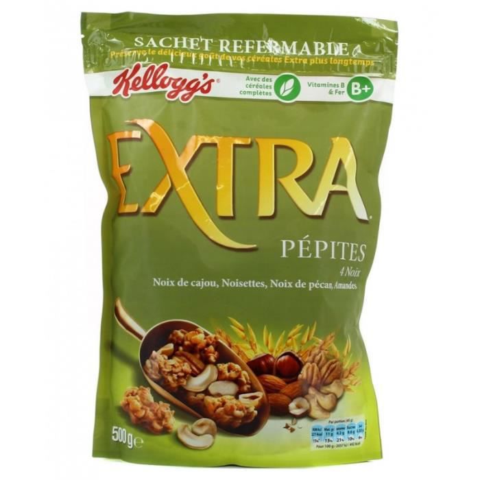 Extra pépites 4 noix. Ingrédients : Flocons d'_avoine_ (49%), Sucre, Huile de palme, Noix (10%) (_Noix de cajou_, _Noisettes_, _Noix de pécan_, _Amandes_), Farine de...