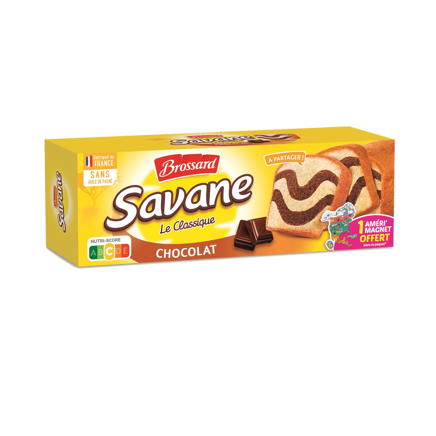 Savane la classique chocolat. Ingrédients : Farine de blé 26,1%, œufs frais, sucre, huile de colza, chocolat 5,8% (sucre, pâte de cacao, beurre de cacao,...