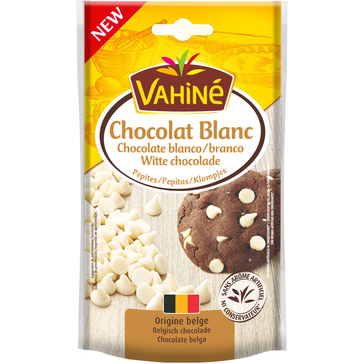 Pépites de chocolat blanc. Ingrédients : sucre, beurre de cacao, _lait_ entier en poudre, _lactosérum_ en poudre (_lait_), _lactose_ (_lait_), émulsifiant•. _lécithine de soja_, extrait...