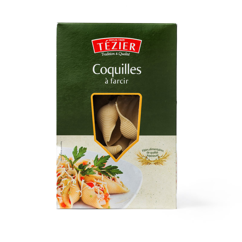 Coquilles a farcir TEZIER. Ingrédients : semoule de blé dur de qualité supérieure TEZIER C'est tellement plus simple Fabriqué en U.E. Marque : Tézier