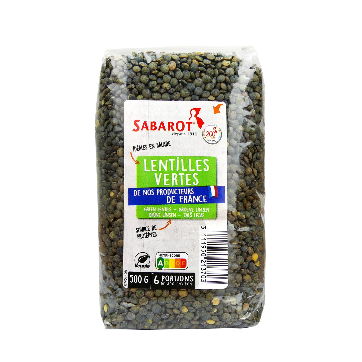 Lentilles vertes. Ingrédients : Lentilles vertes L'atelier fabrique des céréales contenant du gluten. Quantité : 500 g Marque : Sabarot Origine : France