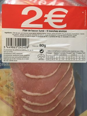 Filet de bacon fumé. Ingrédients : Filet de porc, sel, dextrose, sucre, épices, extraits d'épices, arômes, arôme de fumée, sirop de glucose, conservateurs : lactate...
