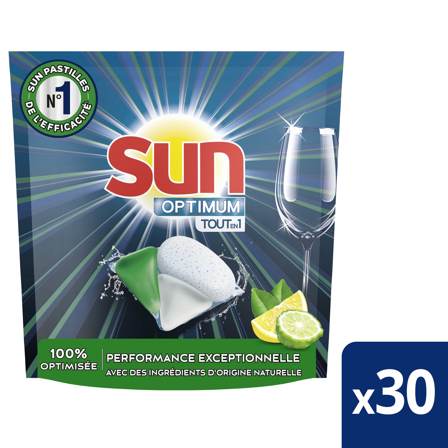 x30 lavagesTOUT EN UN LAVE VAISSELLEDescriptionNe changez rien, Sun change pour vous !Les nouvelles capsules pour lave-vaisselle Sun Optimum Tout En 1 Citron Bergamote associent...