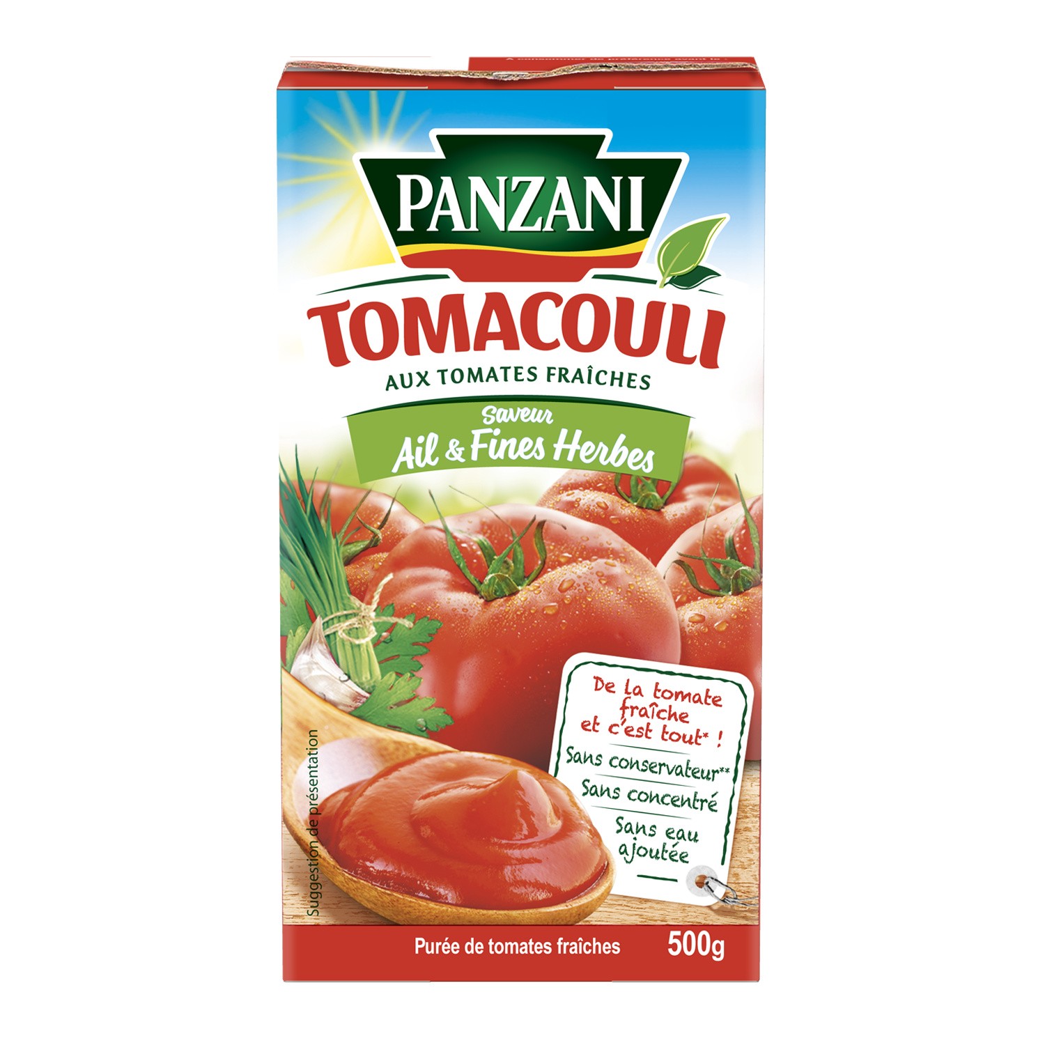 Purée de tomates fraîches réduite à 7% aromatisée à l'ail et aux fines herbes. Ingrédients : Purée de tomates fraîches (99,8 %), arômes naturels d'ail...