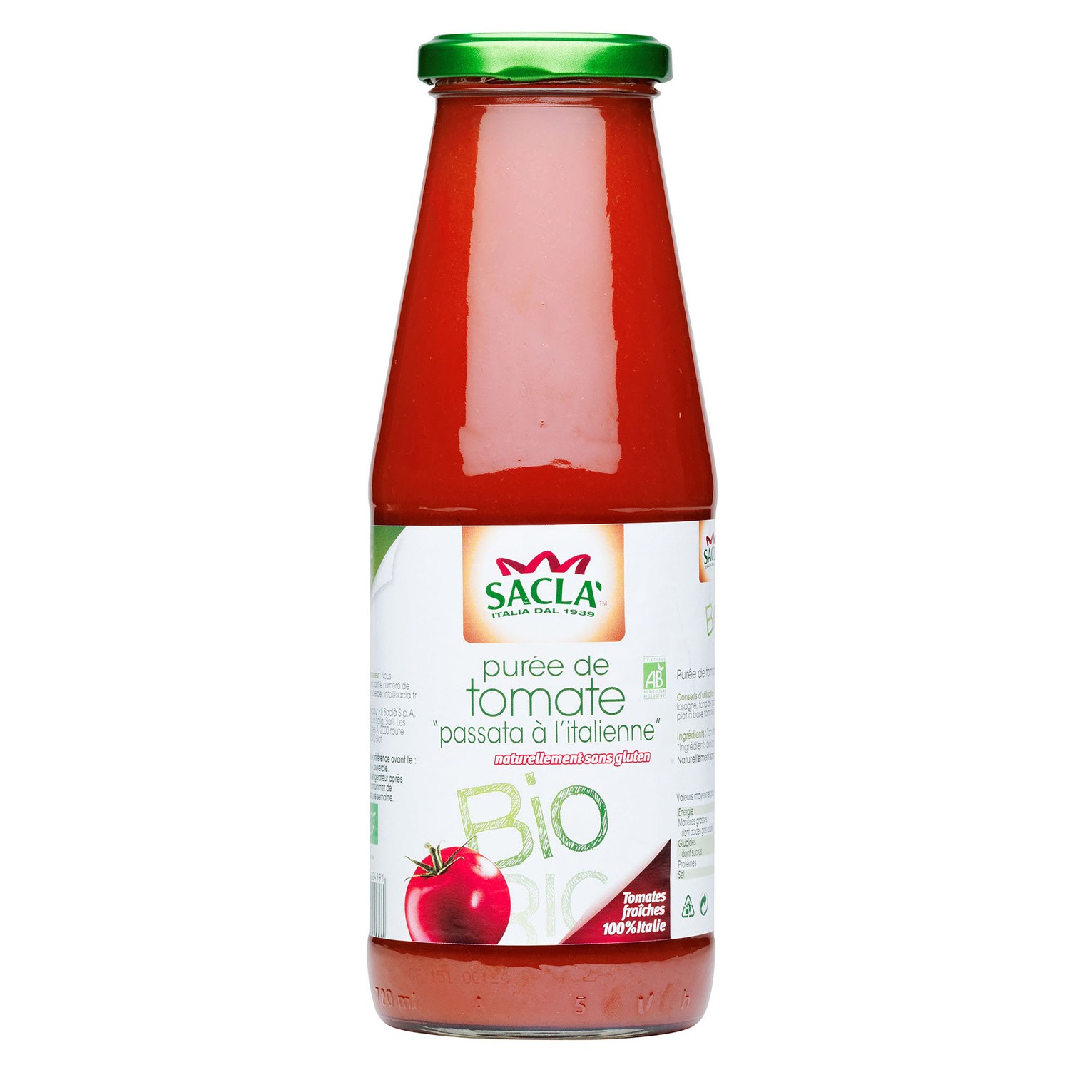 Purée de tomate bio. Ingrédients : Tomates, sel marin. Quantité : 680 g Marque : Sacla Origine : Italie