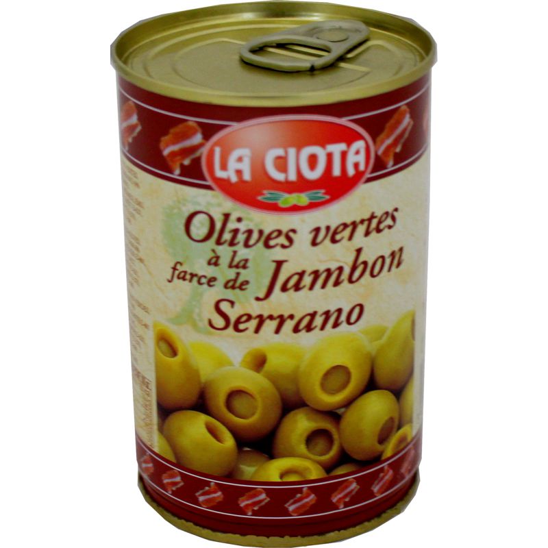 Olives Vertes à la Farce de Jambon Serrano. Ingrédients : Olives vertes, farce de jambon Serrano 6 % (jambon Serrano, stabilisateur E401, arômes), eau, sel,...