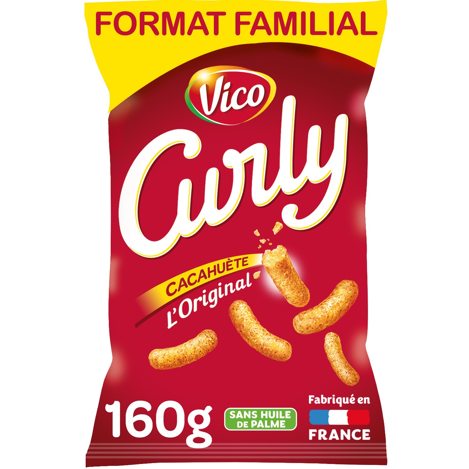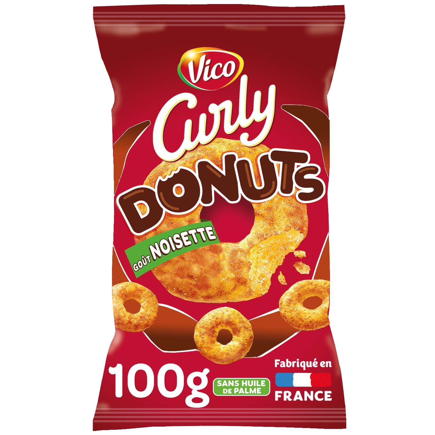 Curly Donuts goût Noisette. Ingrédients : Semoule de maïs, _arachides_ 34%, huile de tournesol, sucre, sel, arôme naturel. Quantité : 100 g Marque : vico,Intersnack...