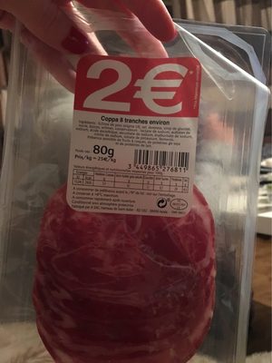 Coppa 8 tranches. Ingrédients : Echine de porc origine UE, sel, dextrose, sirop de glucose. sucre, épices, arômes, conservateurs : lactate de sodium, acétates de...