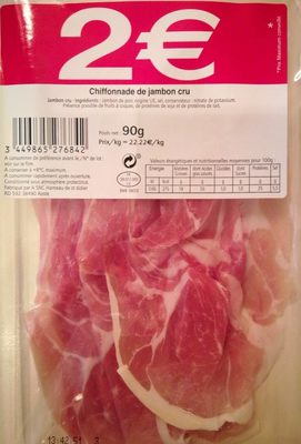 Chiffonade de jambon Cru. Ingrédients : Jambon de porc origine UE, sel, conseruìteur : nitrate de potassiu Présence possible de fruits à coques de protéines...