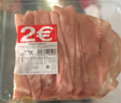 Mortadelle Italienne. Ingrédients : Viande de porc, tripes de porc, amidon, sel, arômes naturel dextrose, épices, antioxydant (E316), conservateur (E250). Quantité : 110 g Marque...