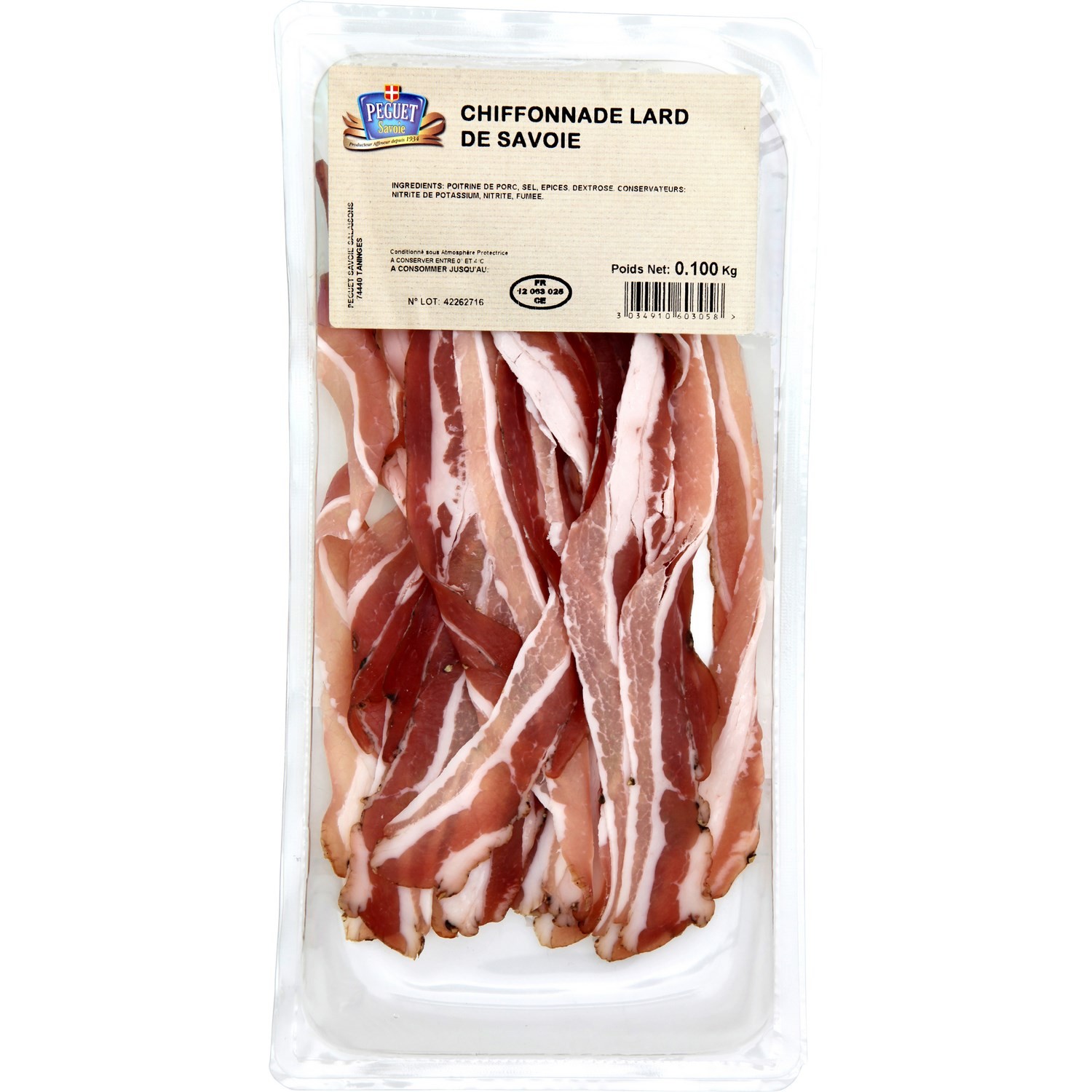 Chiffonnade lard de Savoie. Ingrédients : Poitrine de porc VPF, sel, épices, dextrose, conservateurs : nitrate de potassium, nitrite de sodium, traces éventuelles de lactose...